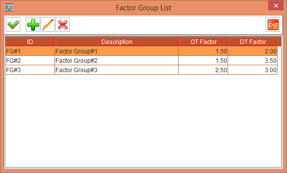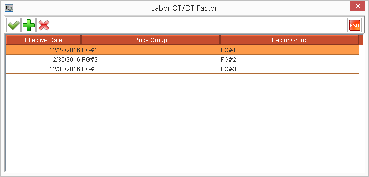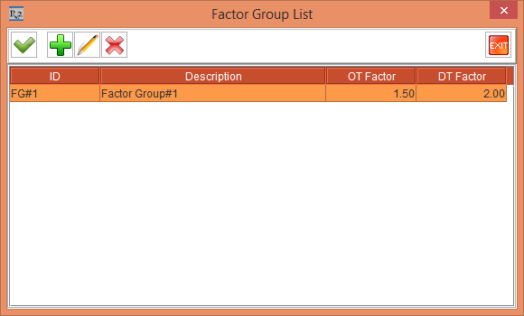 NOTE: The Labor OT/DT Factor dialog box is displayed as a blank list, when no OT/DT Factors are defined in the Configuration module.