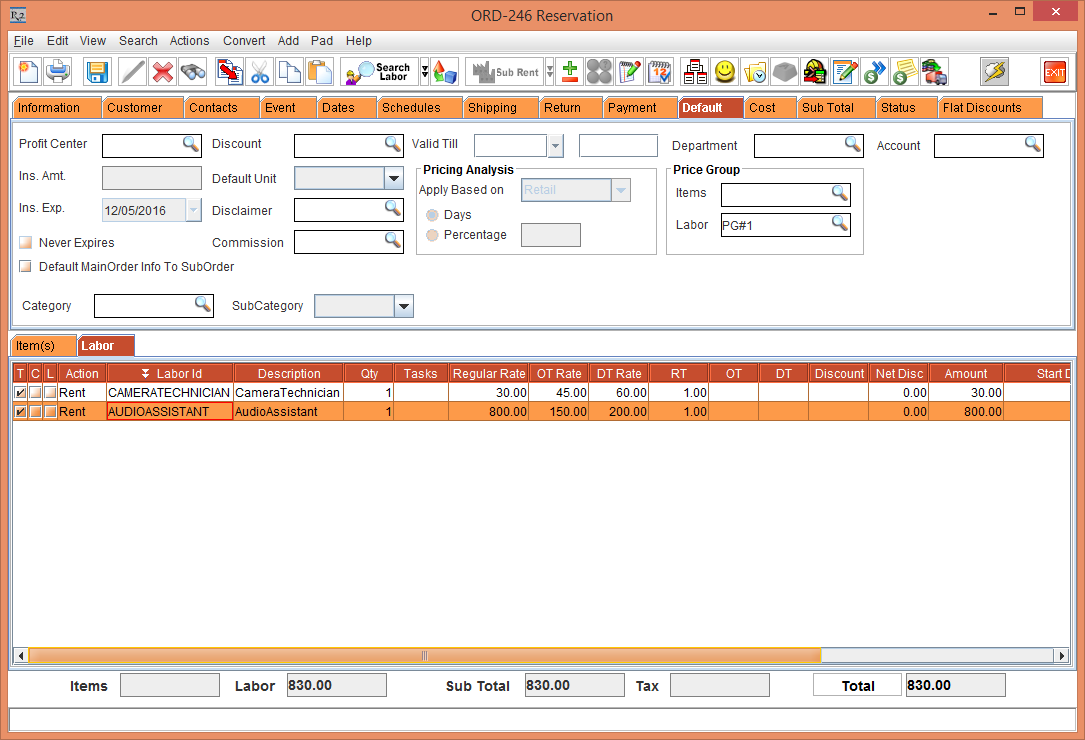 Add the Labor position [AUDIOASSISTANT] to the Rental Reservation Order [ORD-246]. Since the Pricing for the Labor Position [AUDIOASSISTANT] is defined with the Price Group [PG#1] and the Regular Hours [8], the Regular Rate is displayed as 800. The OT Rate and DT Rate fields for the Labor Position [AUDIOASSISTANT] are automatically updated, as shown in the below table based on the defined OT/DT Factors and Pricing. See Figure 16.0