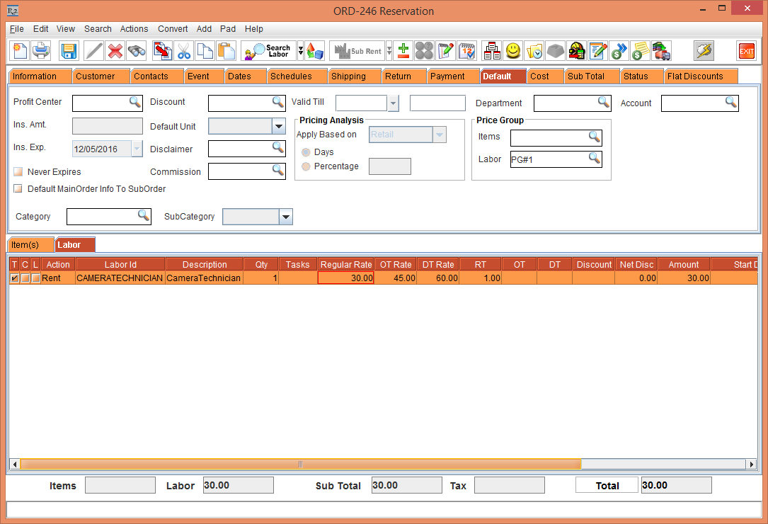 Add the Labor Position [CAMERATECHNICIAN] to the Rental Reservation Order [ORD-246]. Since the Pricing for the Labor Position [CAMERATECHNICIAN] is not defined, the Regular Rate, OT Rate, and DT Rate will be set as 0.00.