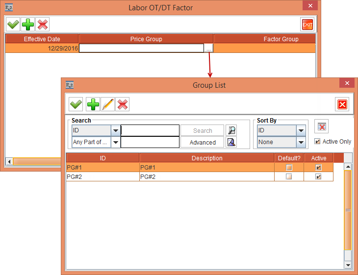Tag the Price Group [PG#1] from the Price Group list. The selected Price Group [PG#1] is tagged to the Price Group column in the Labor OT/DT Factor dialog box.