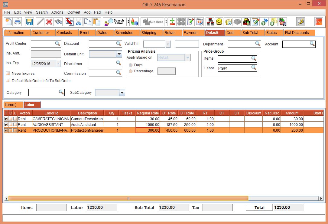 Add the Labor position [PRODUCTIONMANAGER] to the Rental Reservation Order [ORD-246]. The Regular Rate is displayed as 200, OT Rate as 220 and DT Rate as 250 as per Labor Rate Card defined for Price Group [PG#1]. See Figure 18.0