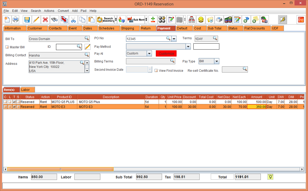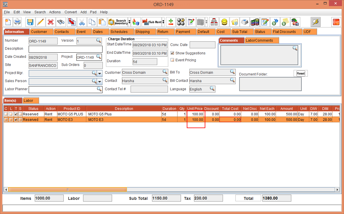Create an Order [ORD-1149] > add the Items [MOTO E3] and [MOTO G5 PLUS] with Unit Price as 100, as shown in Figure 1.0.