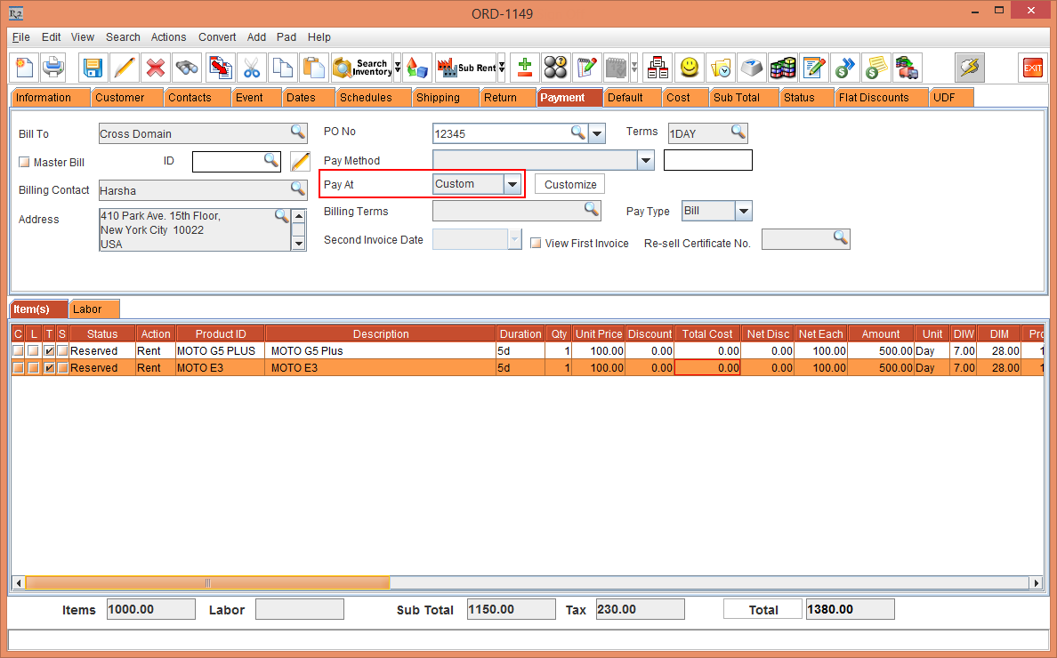 Select the Payment tab > select the Pay At drop-down as Custom as shown in Figure 1.1.