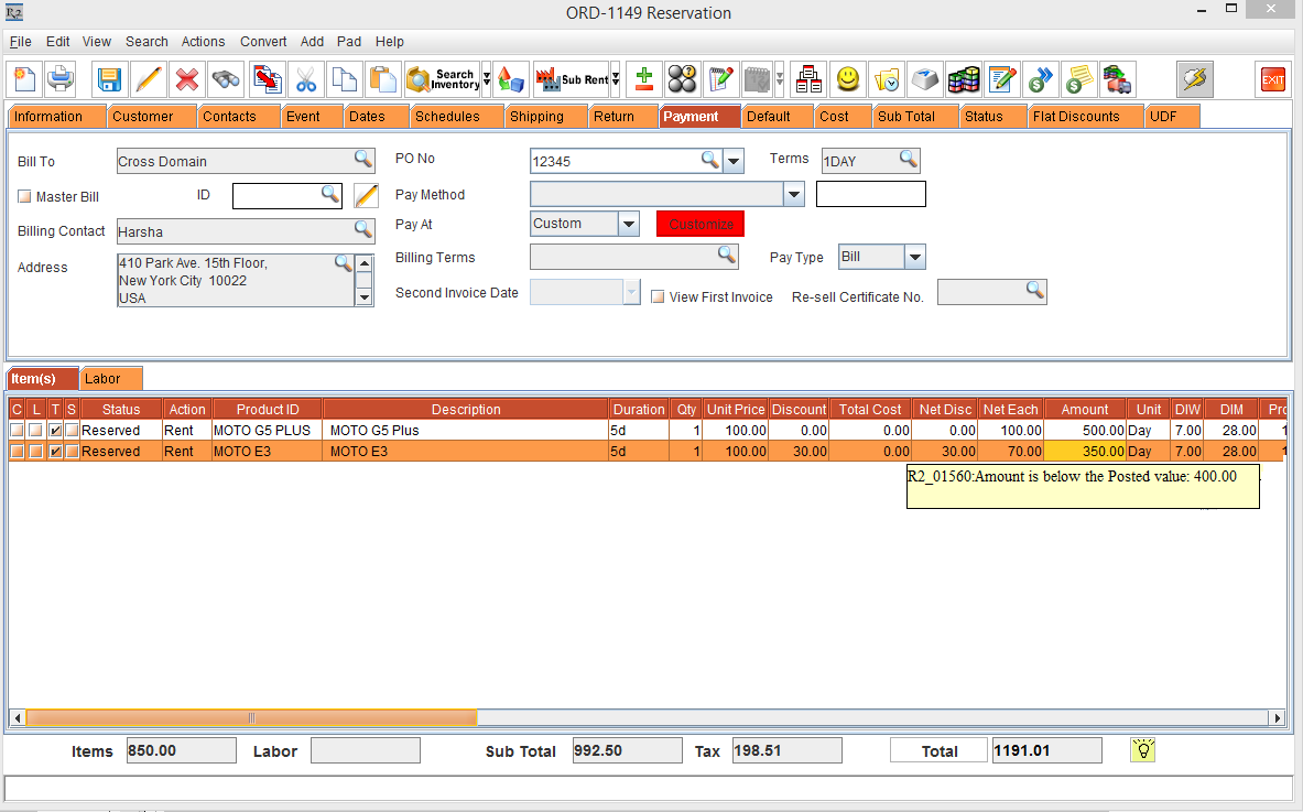 Now, support for showing the error indicators when the Order Amount goes below the Posted Amount but the system allowed you to modify the Order Amount below the posted value. When the Pay At drop-down is selected as Custom.