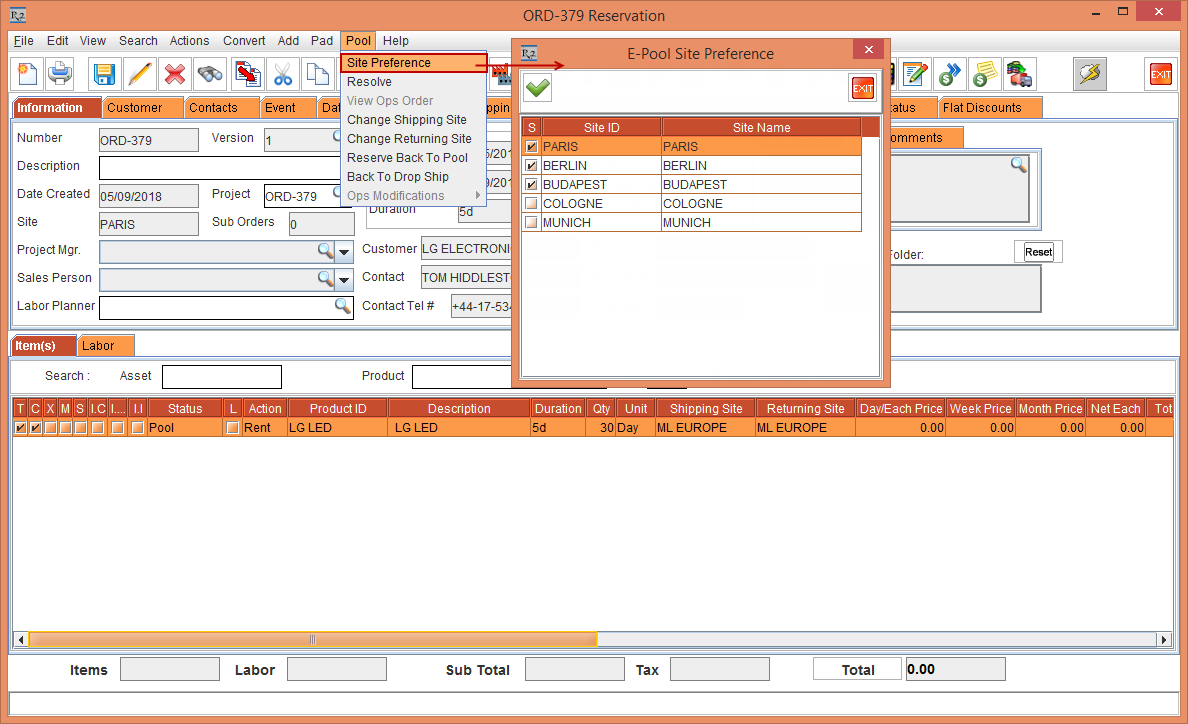 In the Rental Reservation Order [ORD-379], select the Pool menu > Site Preference option > E-Pool Site Preference window.