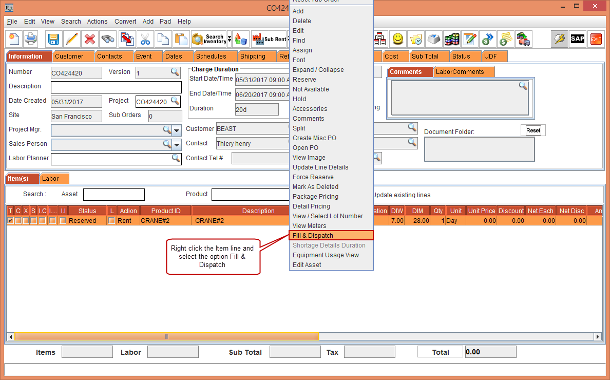 Right click and select the Fill & Dispatch option, as shown in the Figure 1.11.
