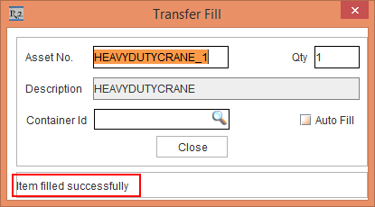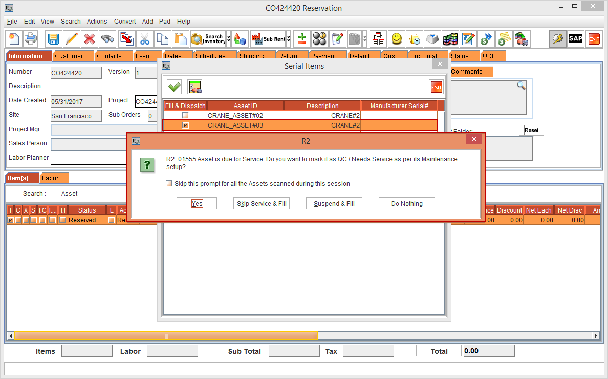 In the Serial Items window, select the Fill & Dispatch check box for the Asset [CRANE_ASSET#03].