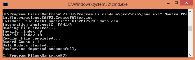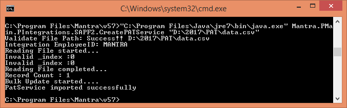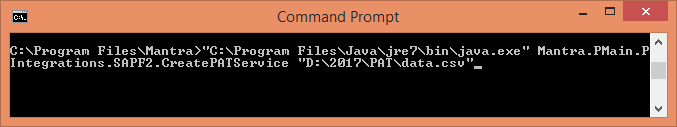"C:\Program Files\Java\jre7\bin\java.exe" Mantra.PMain.PIntegrations.SAPF2.CreatePATService "D:\2017\PAT\data.csv"
