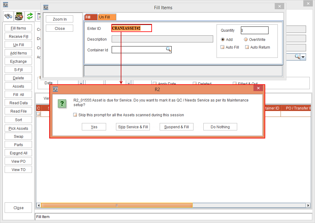 If the Skip this prompt for all the Assets scanned during this session radio button is selected > select a button (Skip Service & Fill or Suspend & Fill), then Exceptions are written for all the selected Assets in the View Exceptions window.