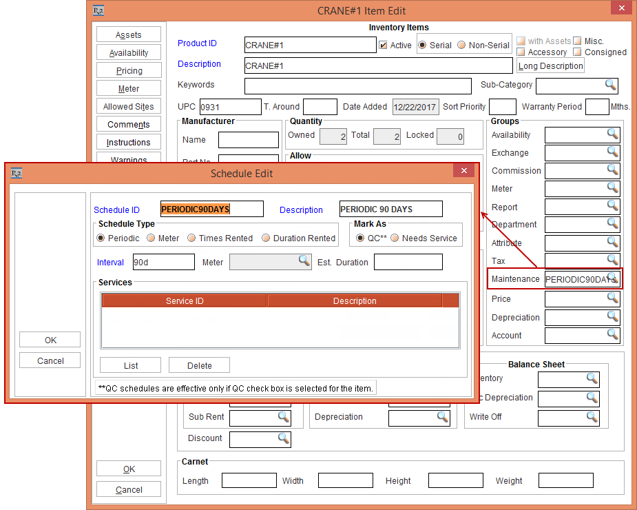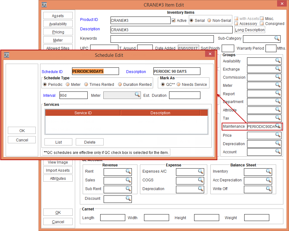 Tag a Maintenance Group [PERIODIC90DAYS] with Maintenance Schedule Periodic 90Days to Item [CRANE#1].