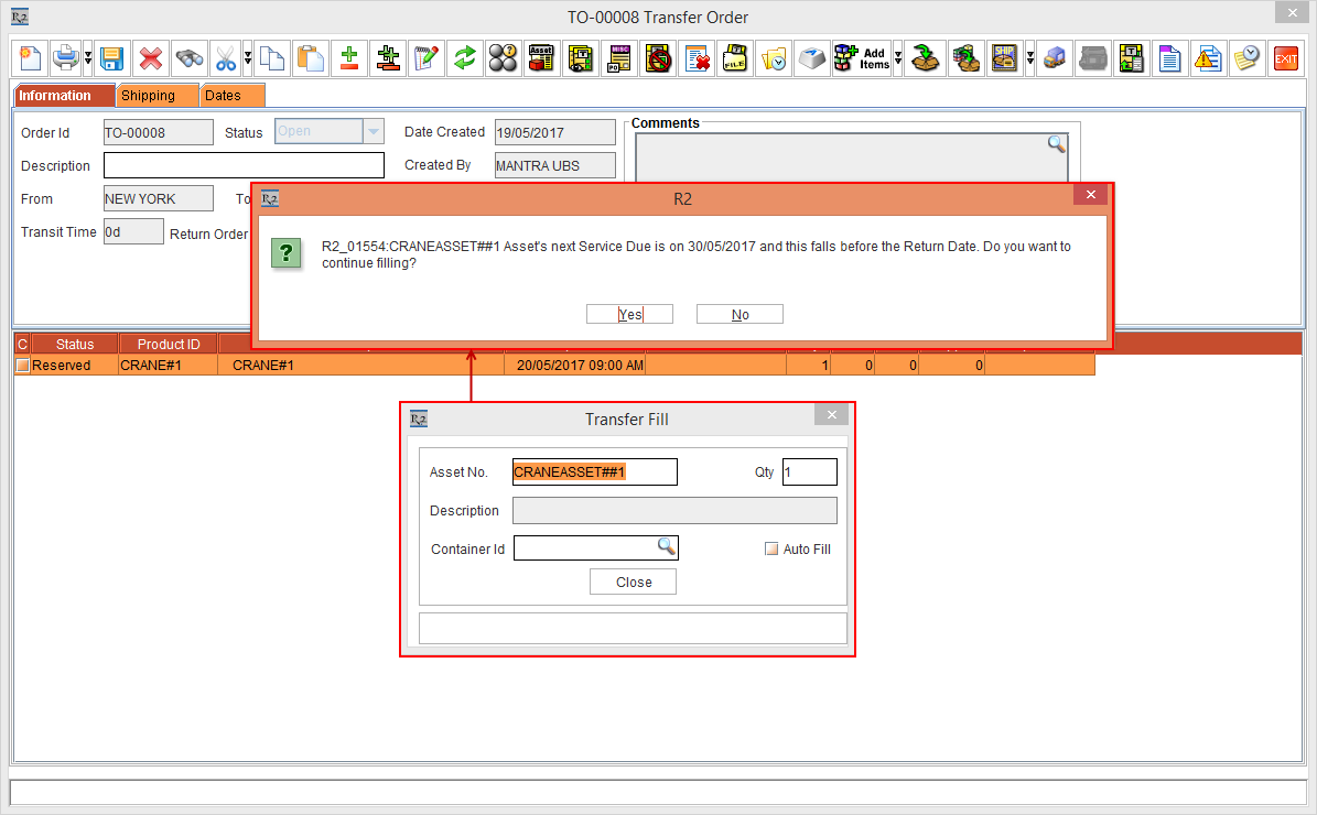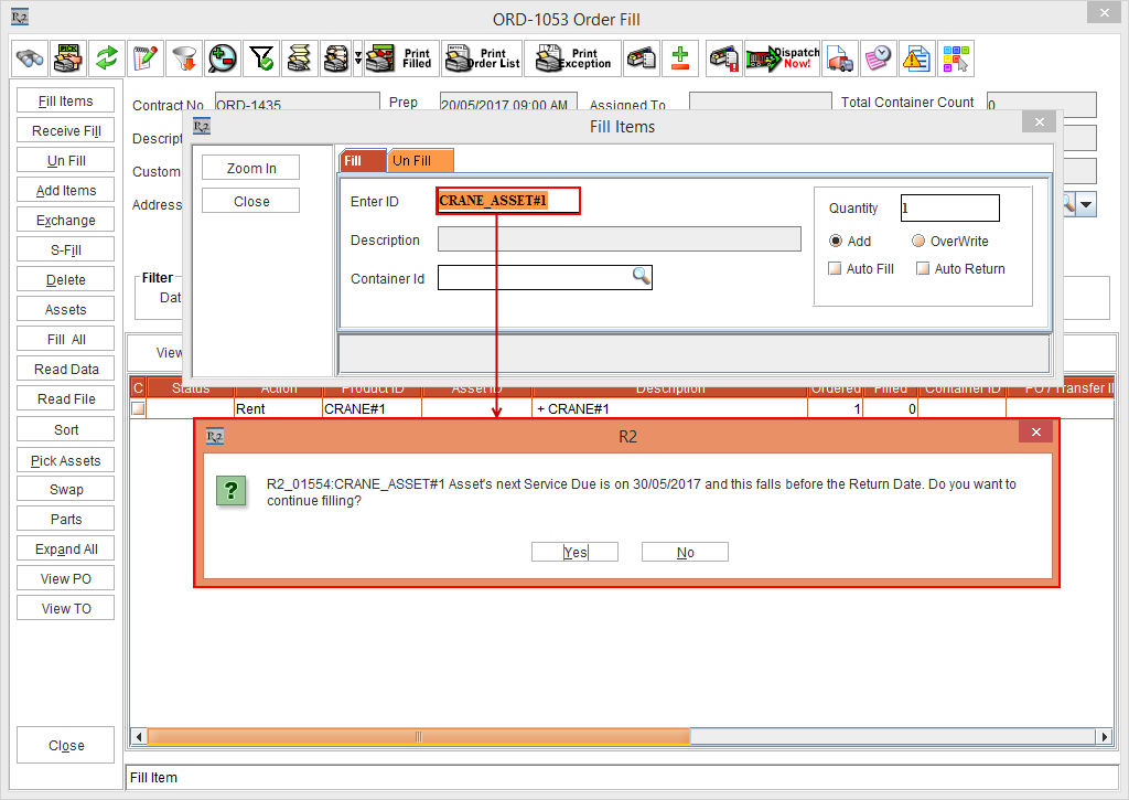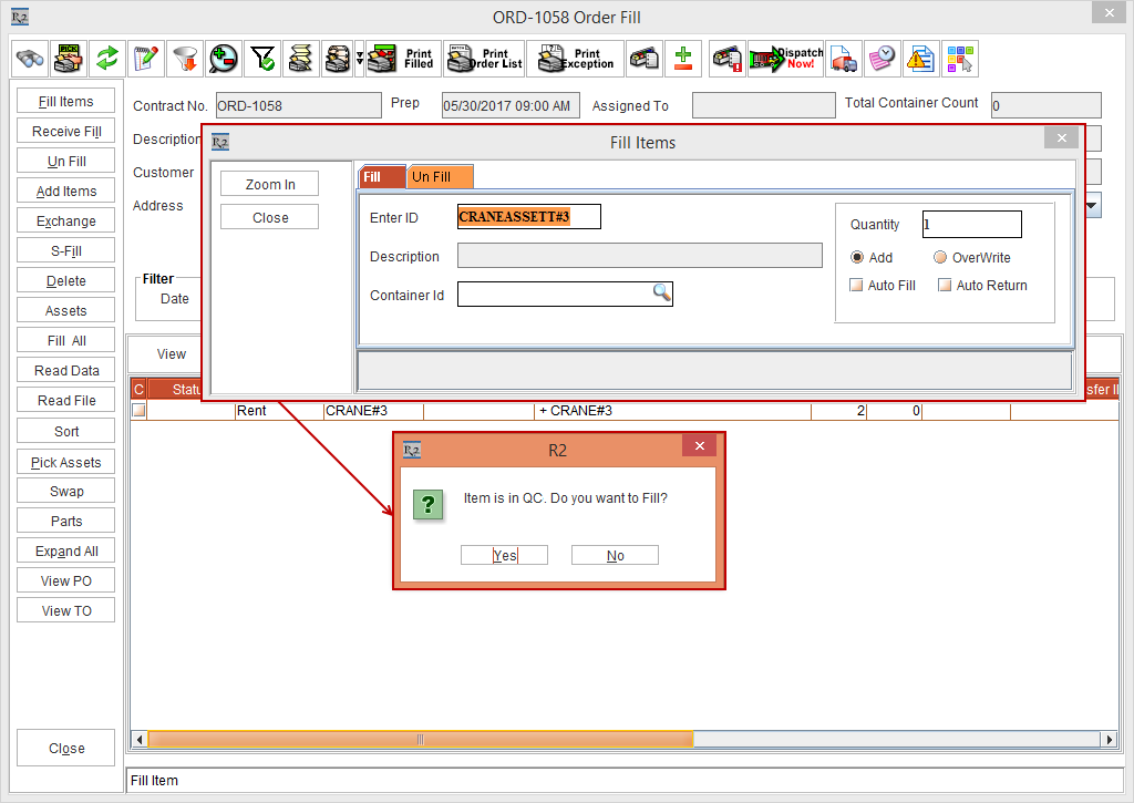 On 30 - May - 2017 open the Prep Task of [ORD-1058] and scan [CRANEASSETT#3] which is in QC Status to fill it. The system displays the message, “This Item is in QC. Do you want to Fill?”, as shown in the Figure 2.3.