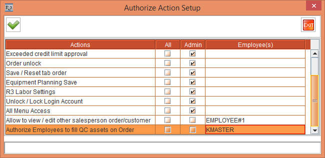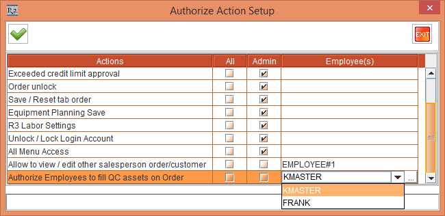 Select the Configuration module > General tab > click the Authorize Action Setup button. The Authorize Action Setup window is displayed. Select the Employees [KMASTER] and [FRANK] in the Authorize Employees To Fill Qc Assets on Order Action (do not select check-box for All or Admin) > click the OK button.