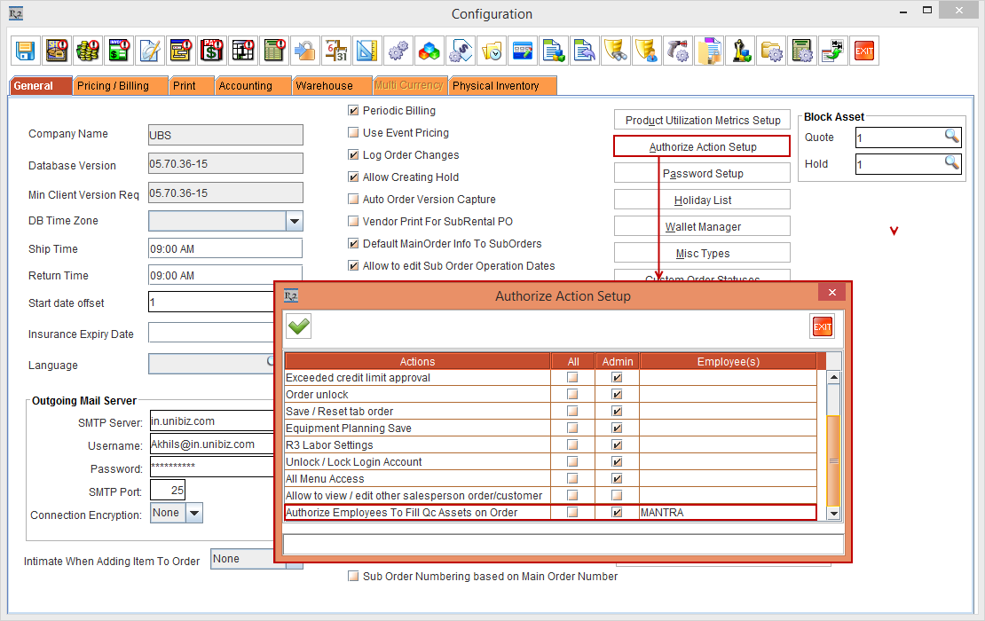 Select the Configuration module > General tab > click the Authorize Action Setup button. The Authorize Action Setup window is displayed. Select the Employee [MANTRA] in the Authorize Employees to fill QC Assets on Order Action > click the OK button.
