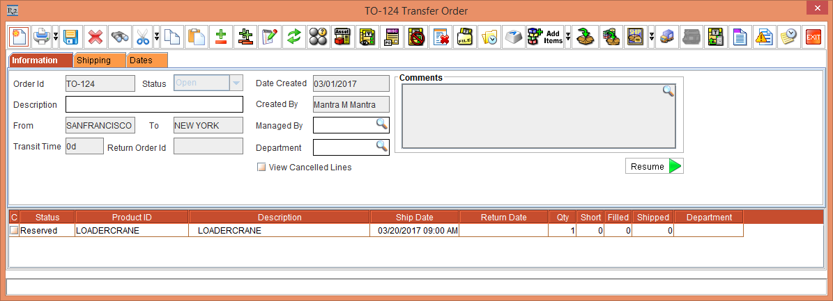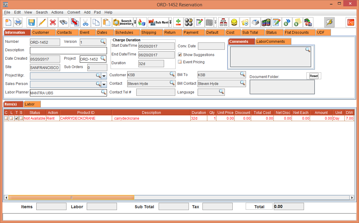Add the Item [CRANE#2] to the Rental Reservation Order [ORD-1134]. Do not Generate Needs Service.