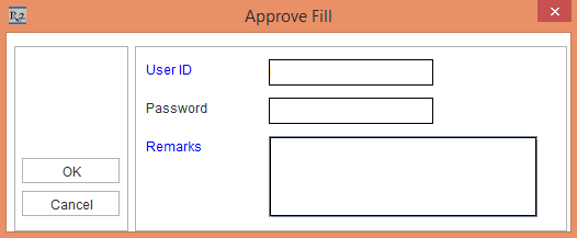 NOTE: when Close button is clicked, the system does not perform any operation in the Approve Fill dialog until the User ID, Password and Remarks are entered.