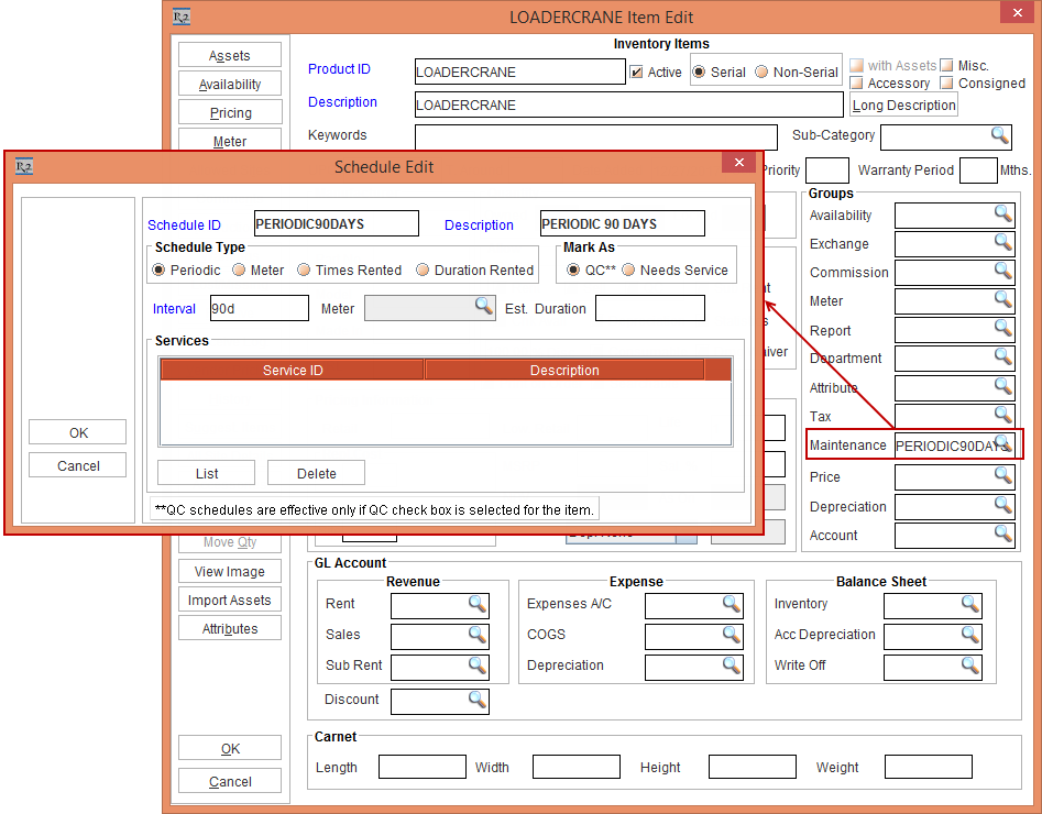 Tag a Maintenance Group [PERIODIC90DAYS] with Maintenance Schedule Periodic 90Days to Item [CRANE#2]. This is , as shown in Figure 1.6.