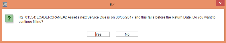 On the 20 - June - 2017, the Return Date of the Order, open the Return Task of the Order [ORD-1053] and scan the Asset [CRANE_ASSET#1] to return. The system displays the prompt, as shown in the Figure 1.5. The system displays the message as, “Asset is due for Service. Do you want to mark it as QC/Needs Service as per its Maintenance Setup?”