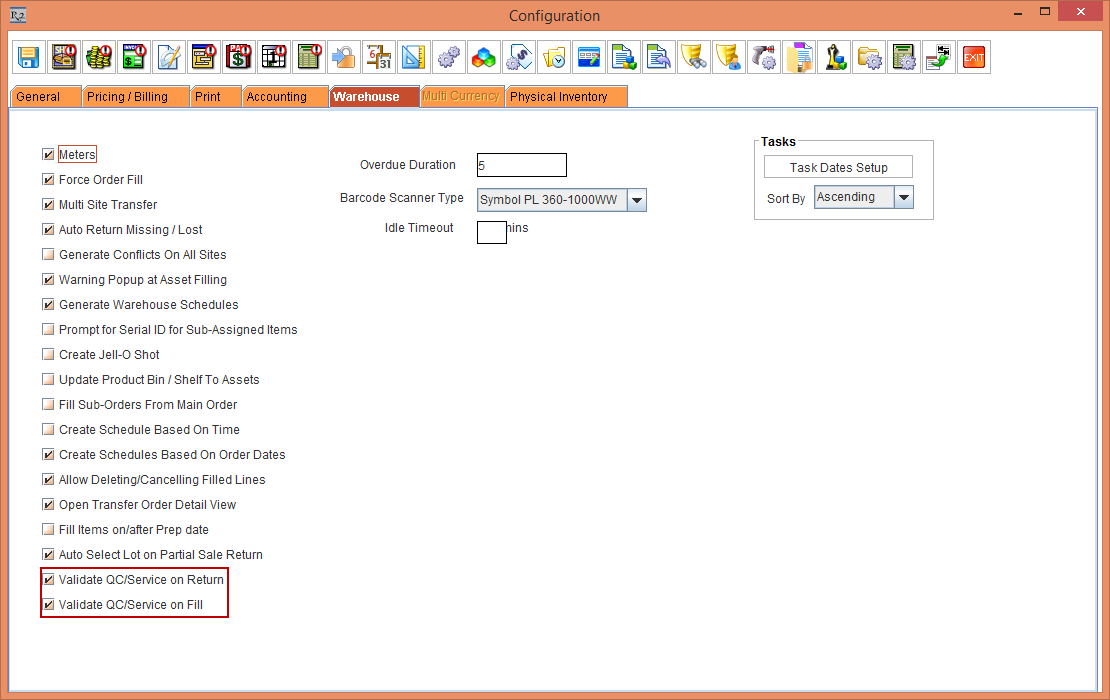 Select the Warehouse tab > select the check-boxes Validate QC/Service on Return and Validate QC/Service on Fill. This is as shown in Figure 2.1. Save and exit Configuration module.