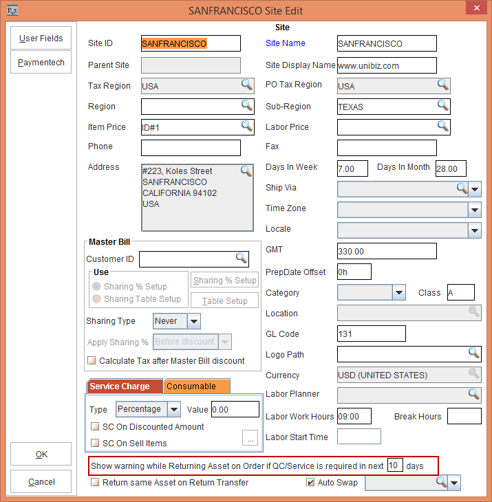 Select the Maintenance module > Employee tab > Site > select the Site [SANFRANCISCO]. Enter 10 in the Show Warning On Return If QC/Service Is Required In Next Days field. This is as show in the Figure 1.2.