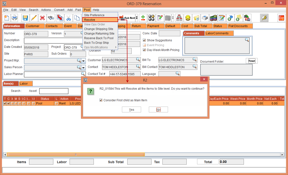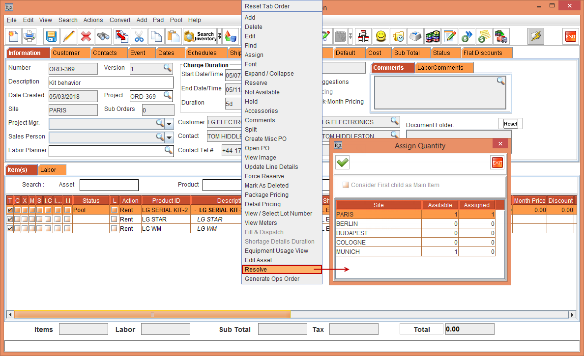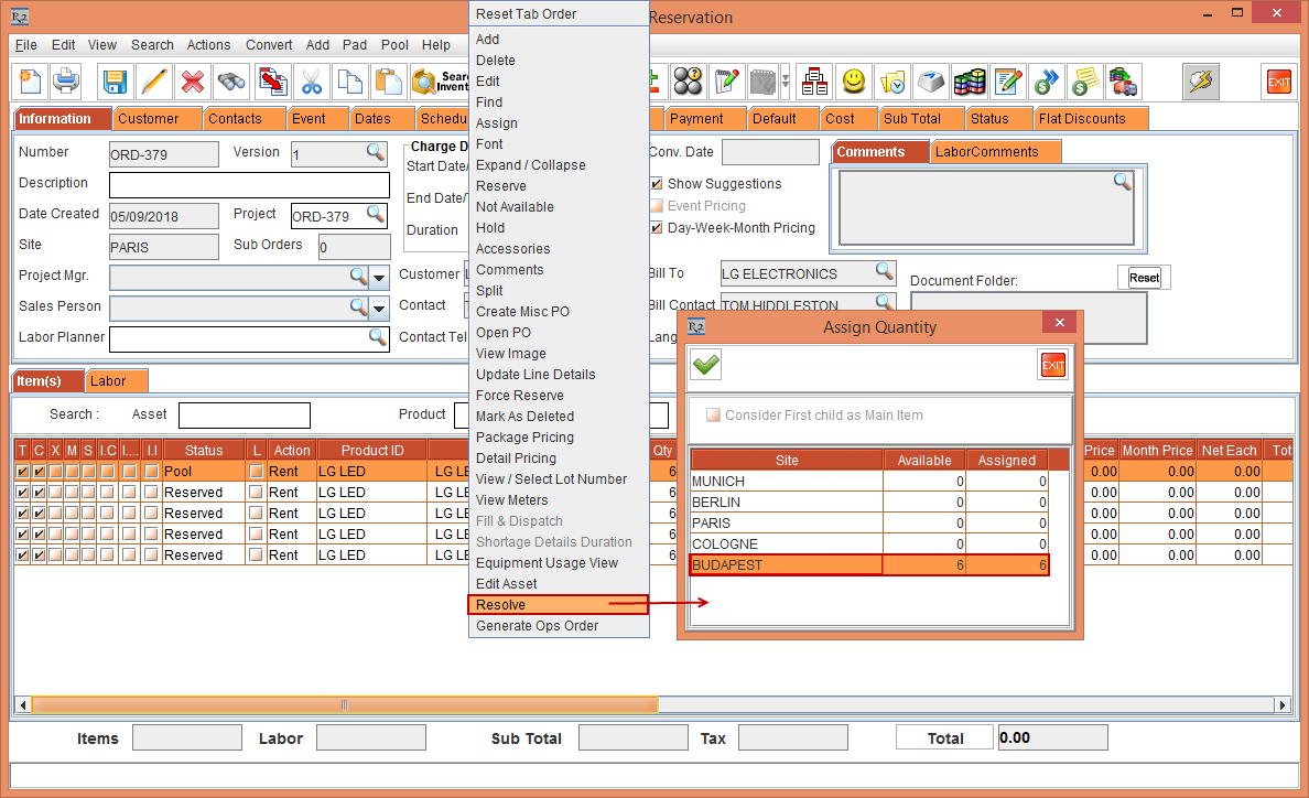 In the Rental Reservation Order [ORD-379], select the Item line [LG LED] with 30 Qty and select the Pool menu > Resolve option.