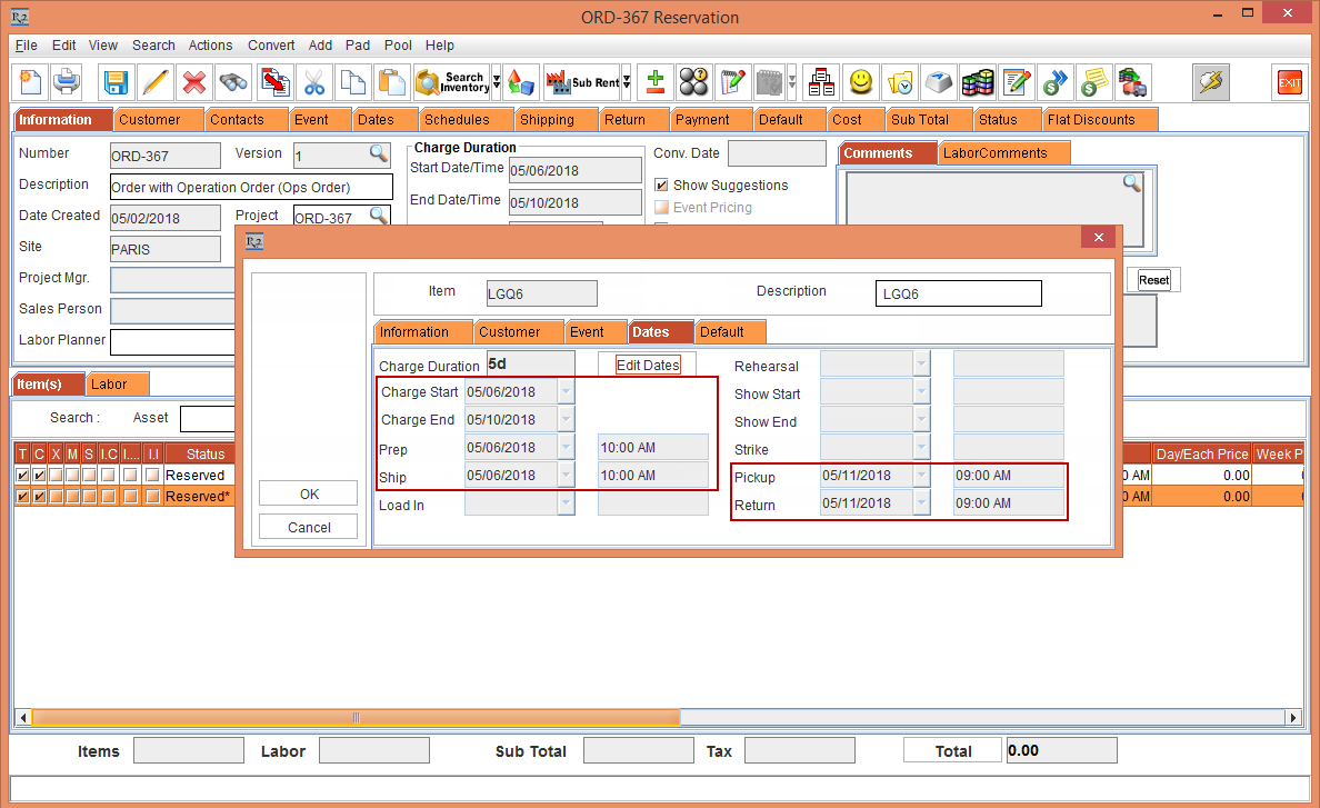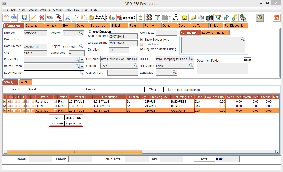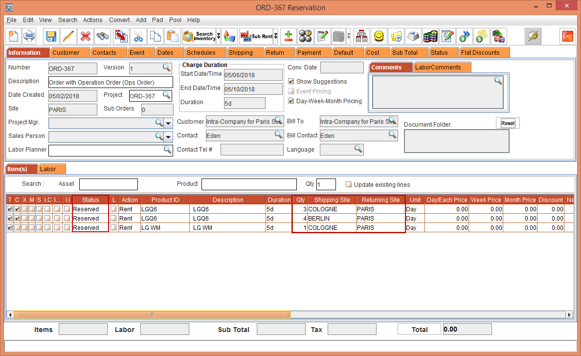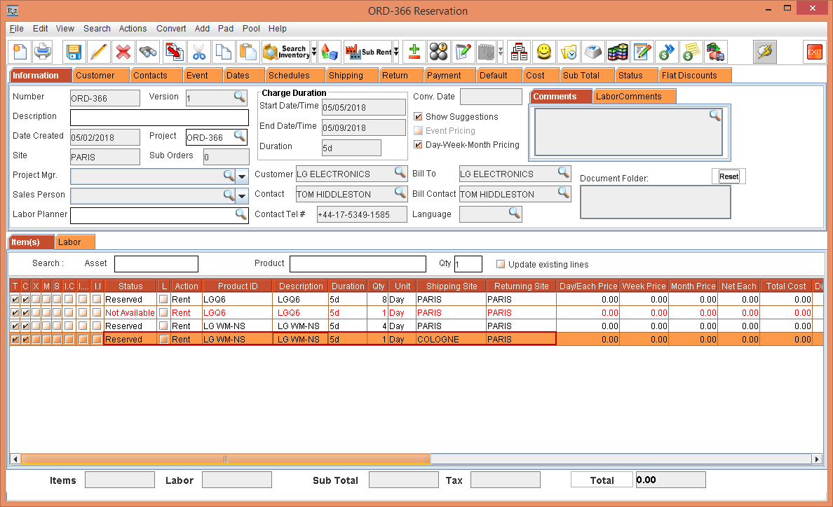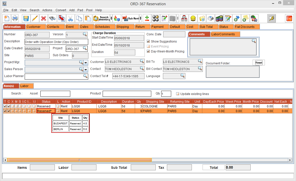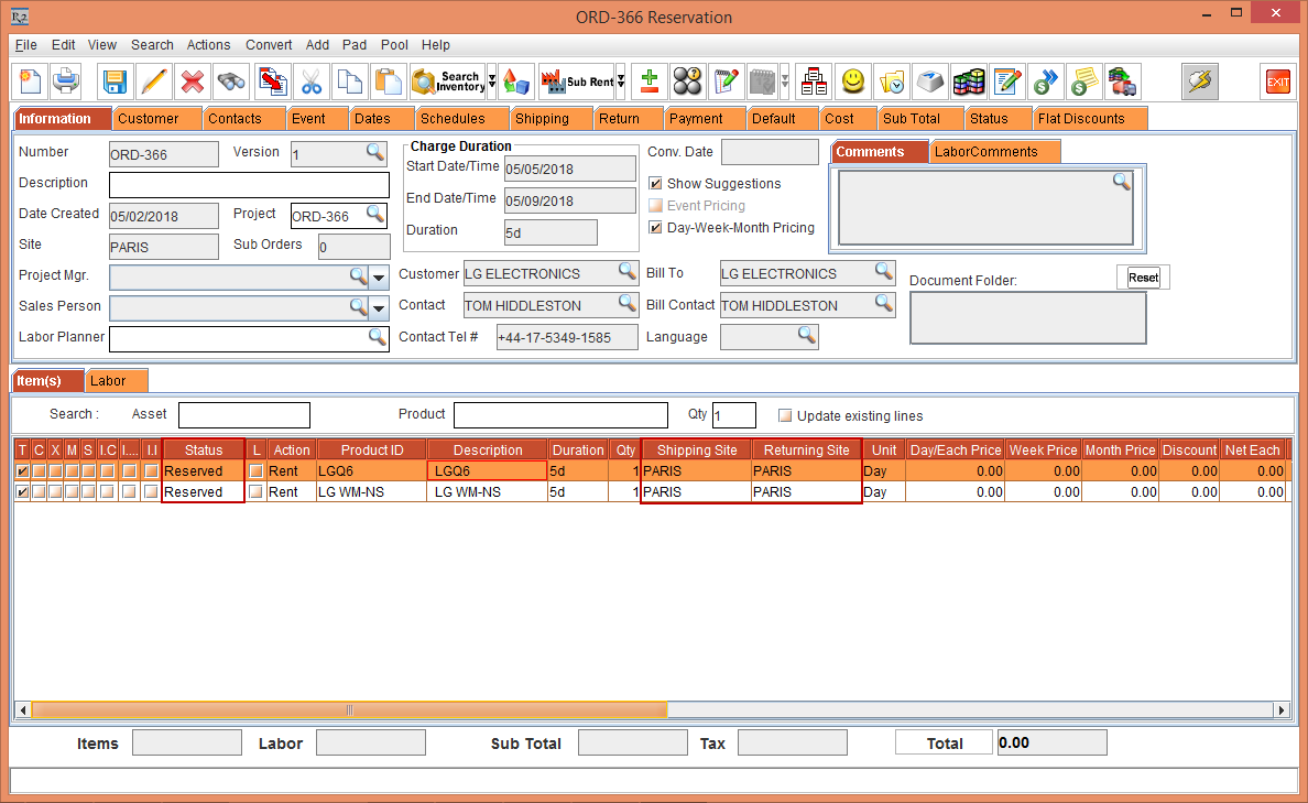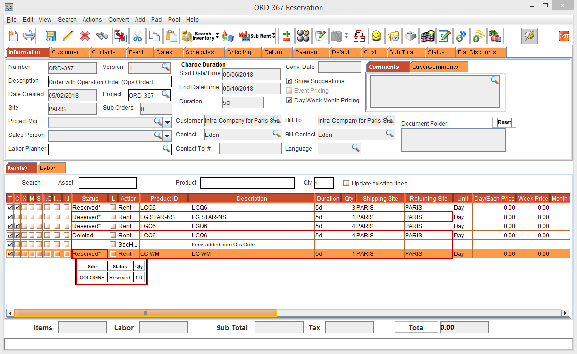 Whereas, the Status of the Item [LG WM-NS] is displayed as Reserved due to the Start Date [01-May-2018] and End Date [10-May-2018] which is within the Cutoff time in days [3]. The Shipping Site and the Returning Site is displayed as the Order Site [PARIS].