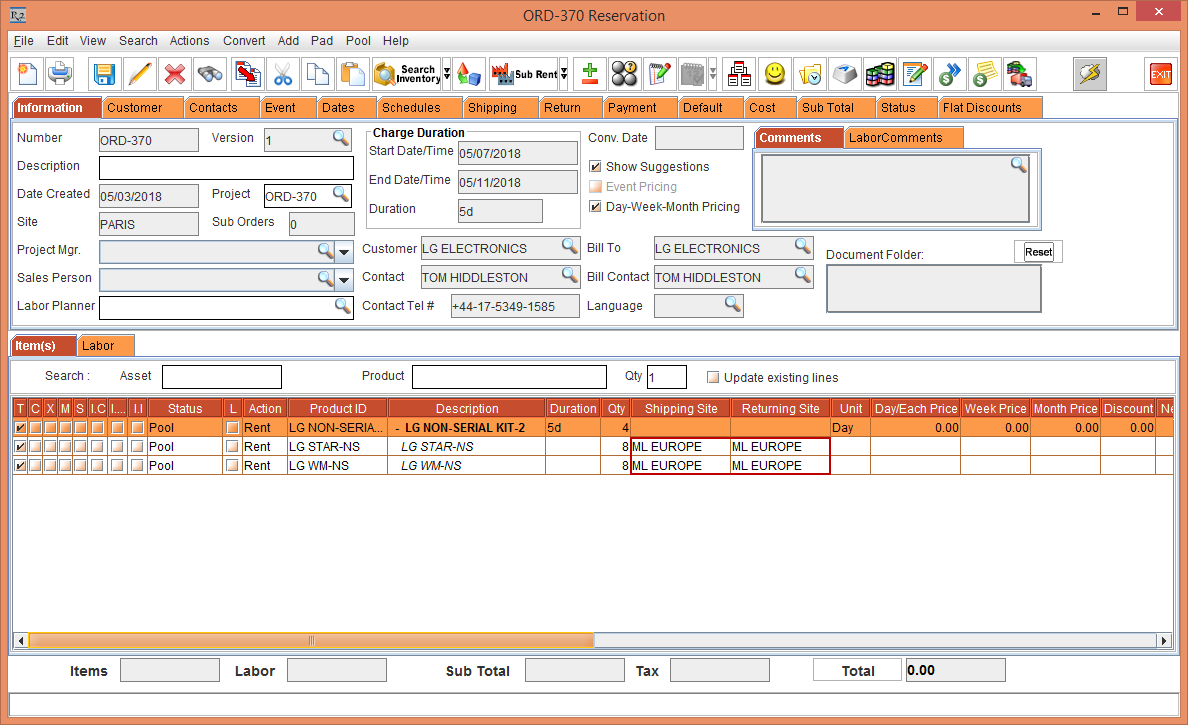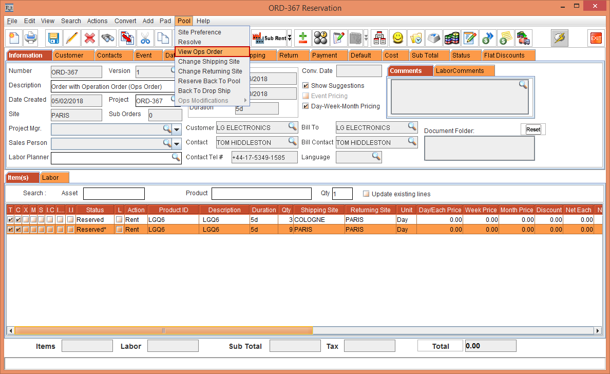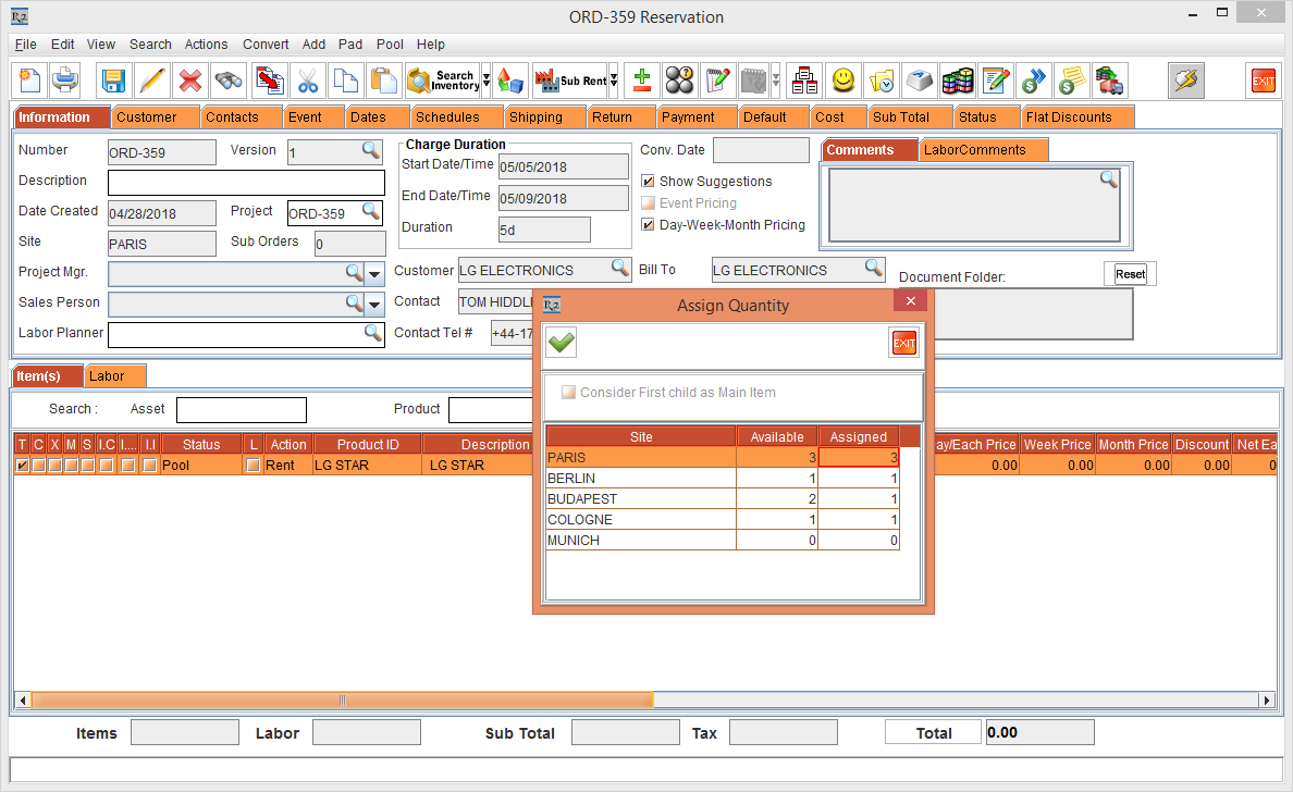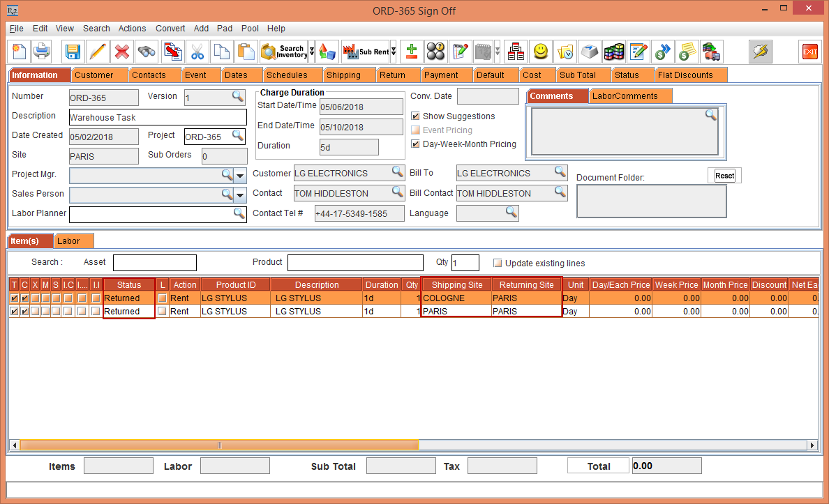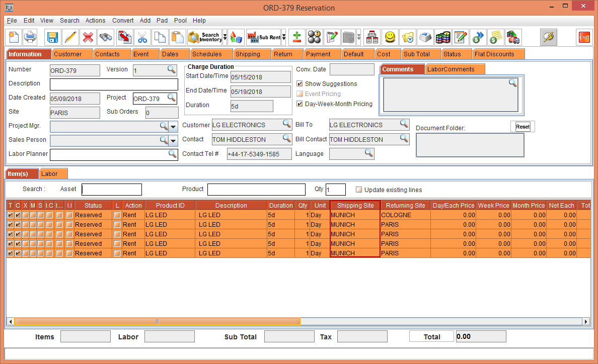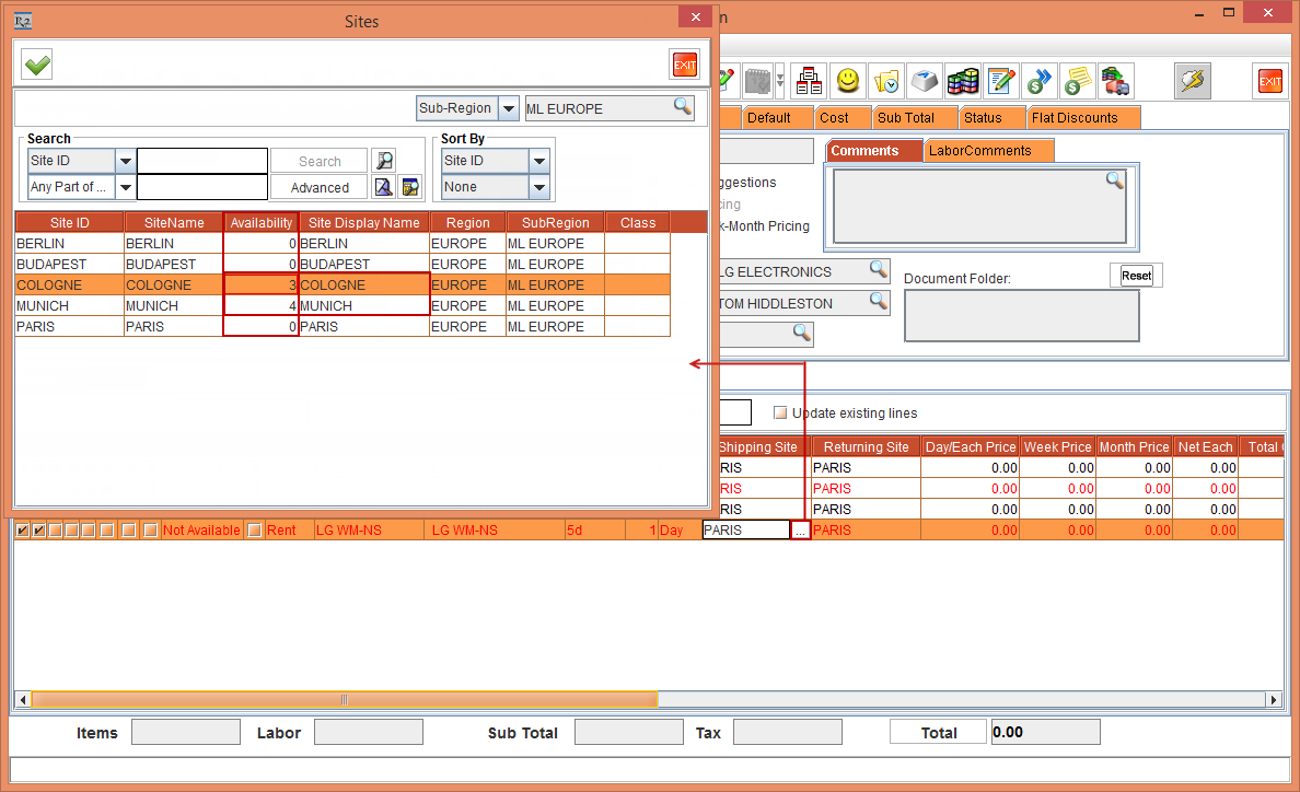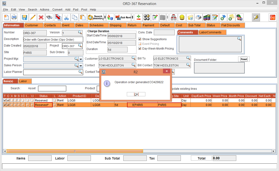 Whereas, the Status of the Item [LG WM-NS] is displayed as Reserved due to the Start Date [01-May-2018] and End Date [10-May-2018] which is within the Cutoff time in days [3]. The Shipping Site and the Returning Site is displayed as the Order Site [PARIS].