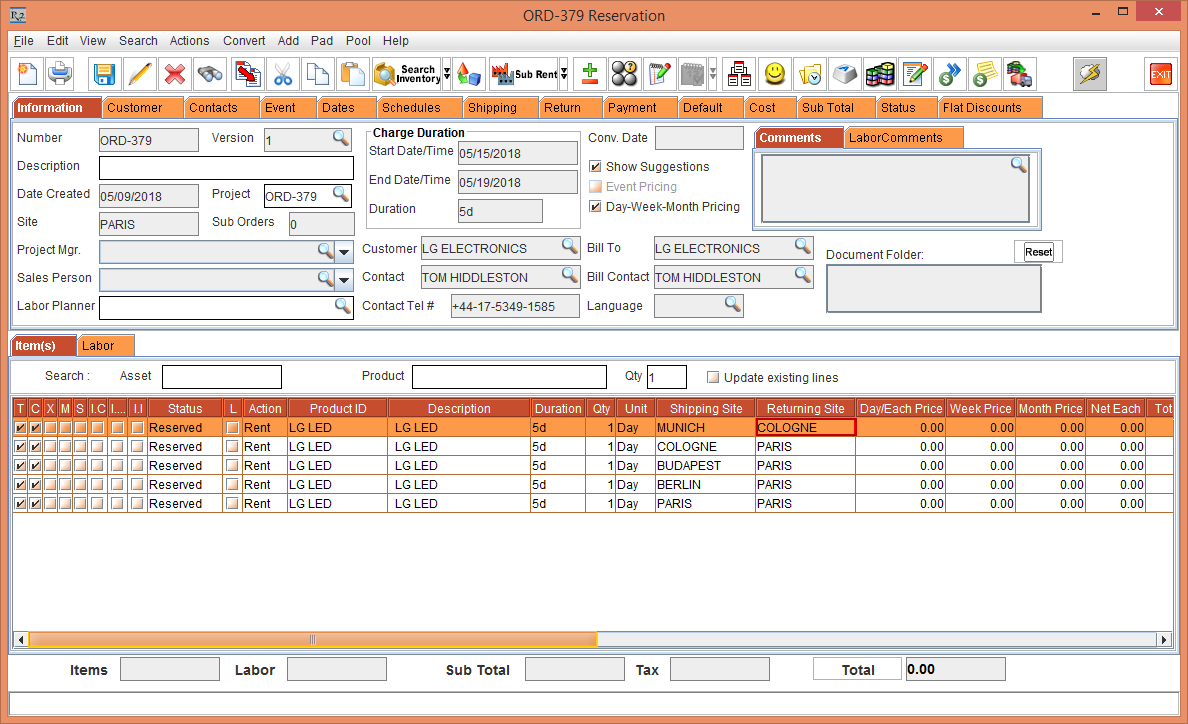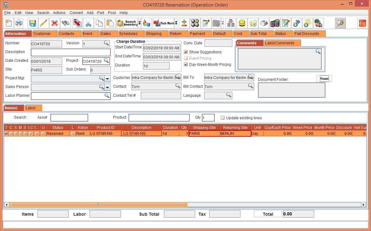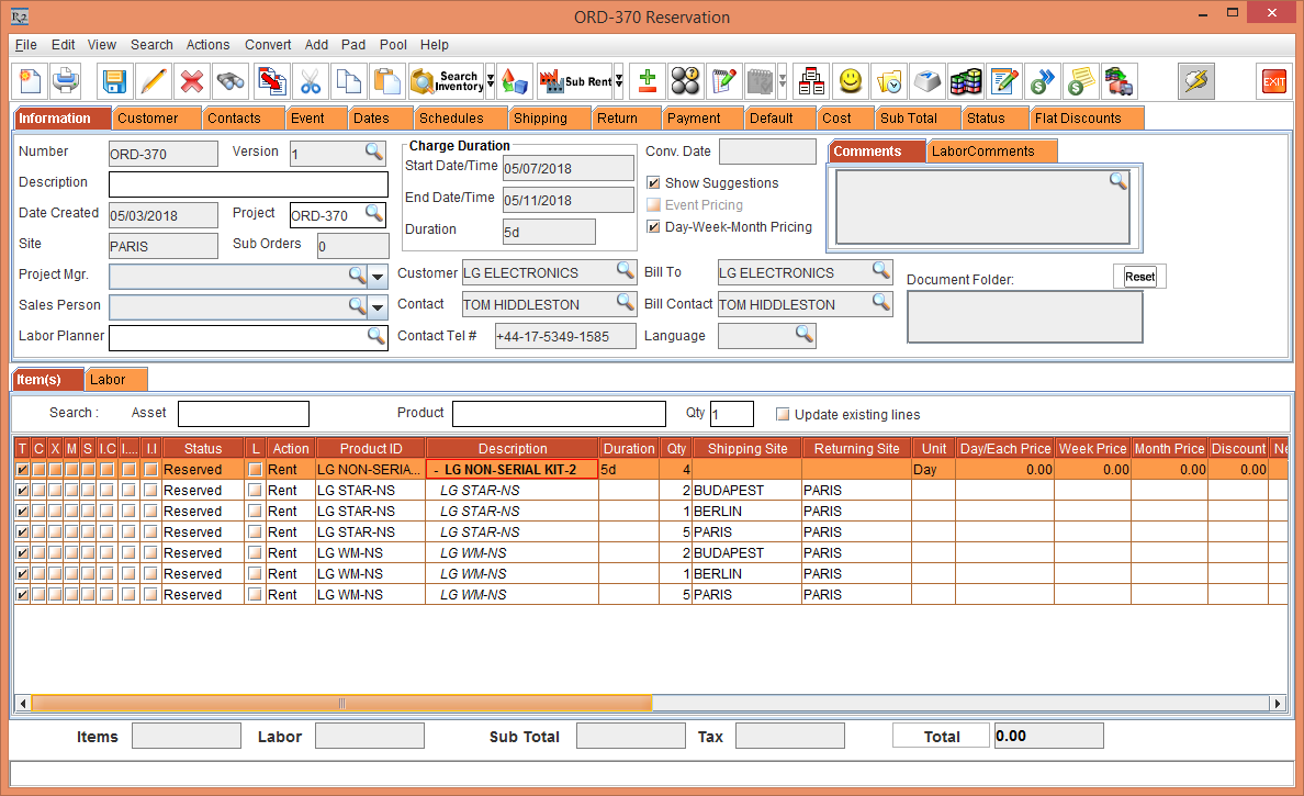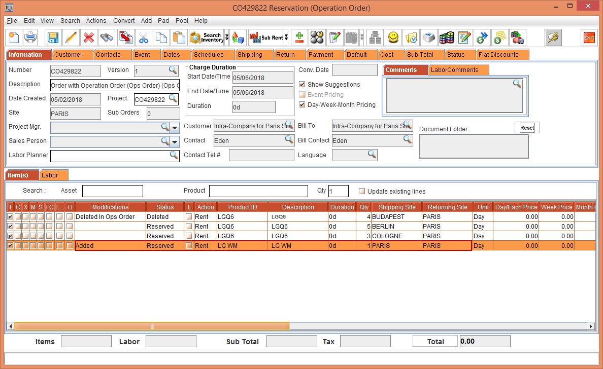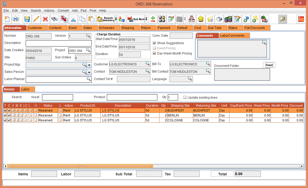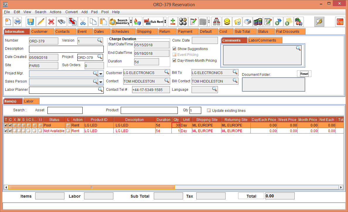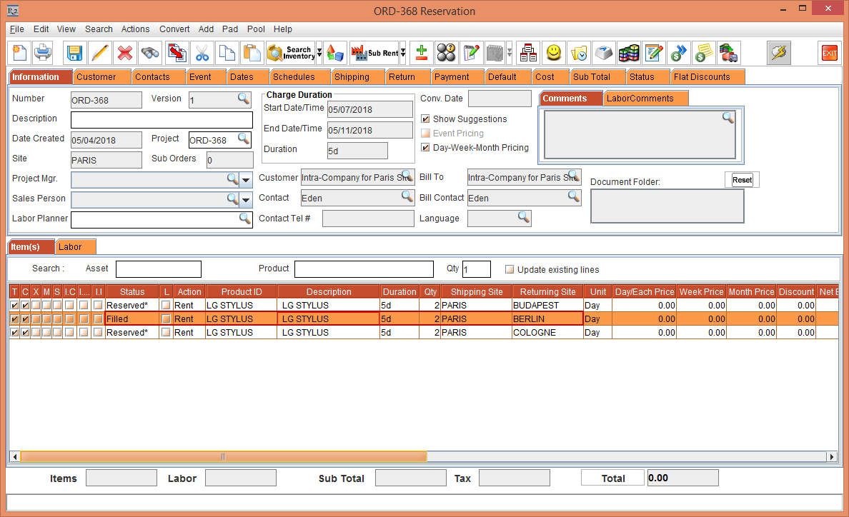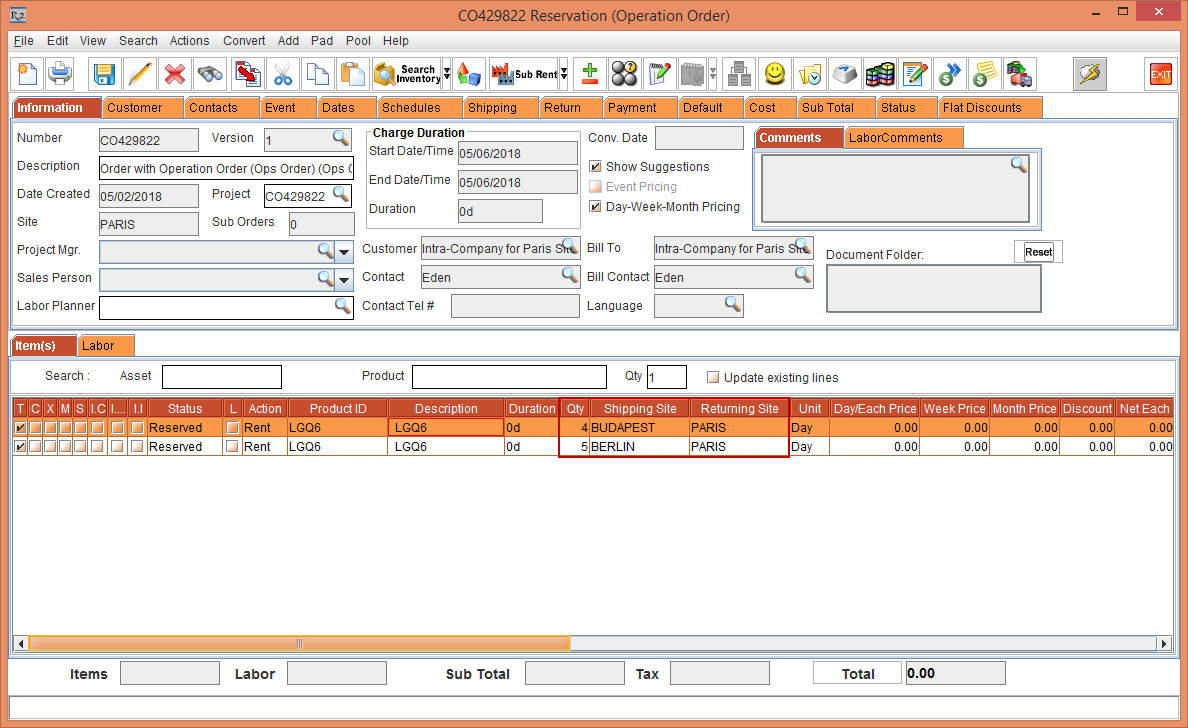 Whereas, the Status of the Item [LG WM-NS] is displayed as Reserved due to the Start Date [01-May-2018] and End Date [10-May-2018] which is within the Cutoff time in days [3]. The Shipping Site and the Returning Site is displayed as the Order Site [PARIS].