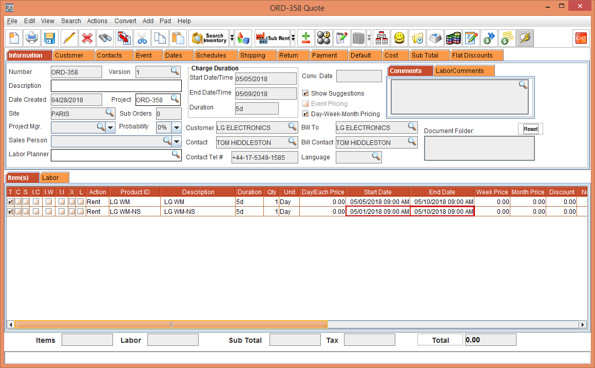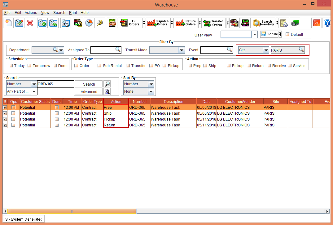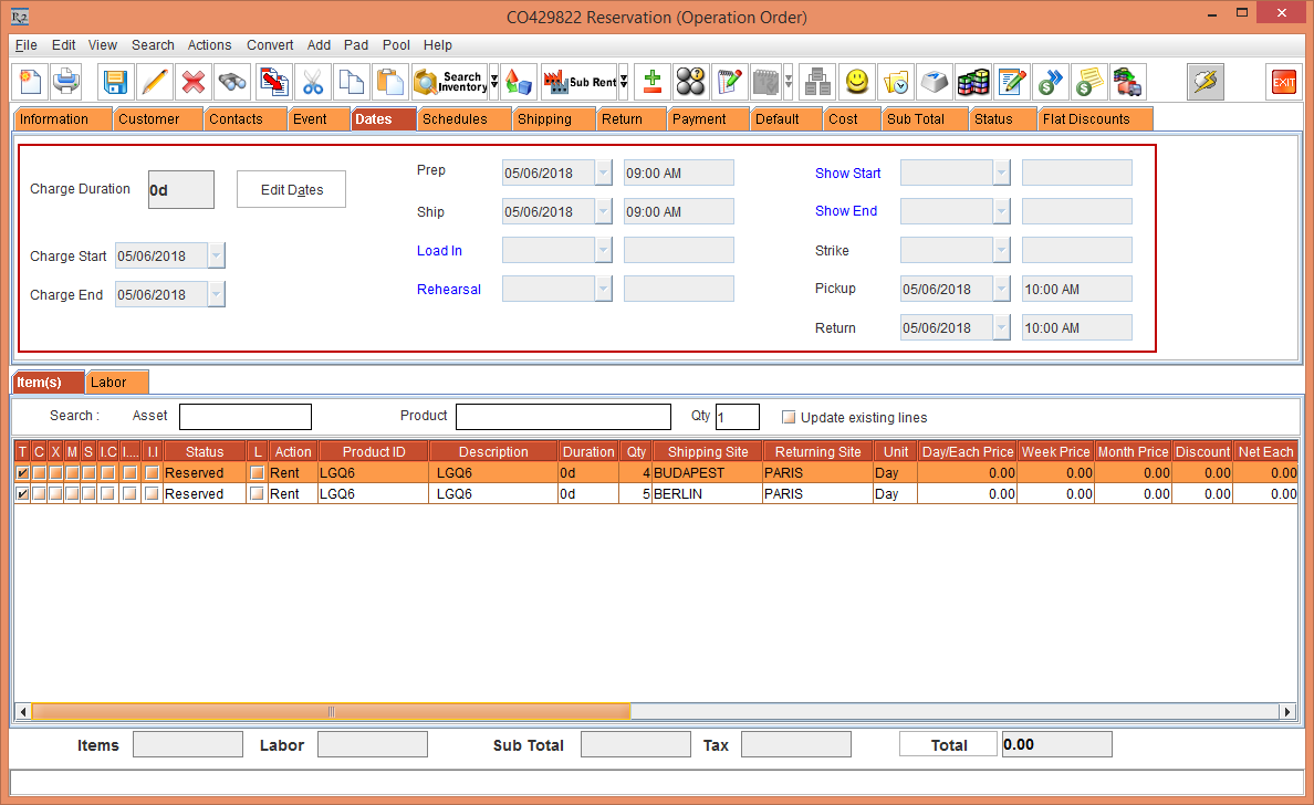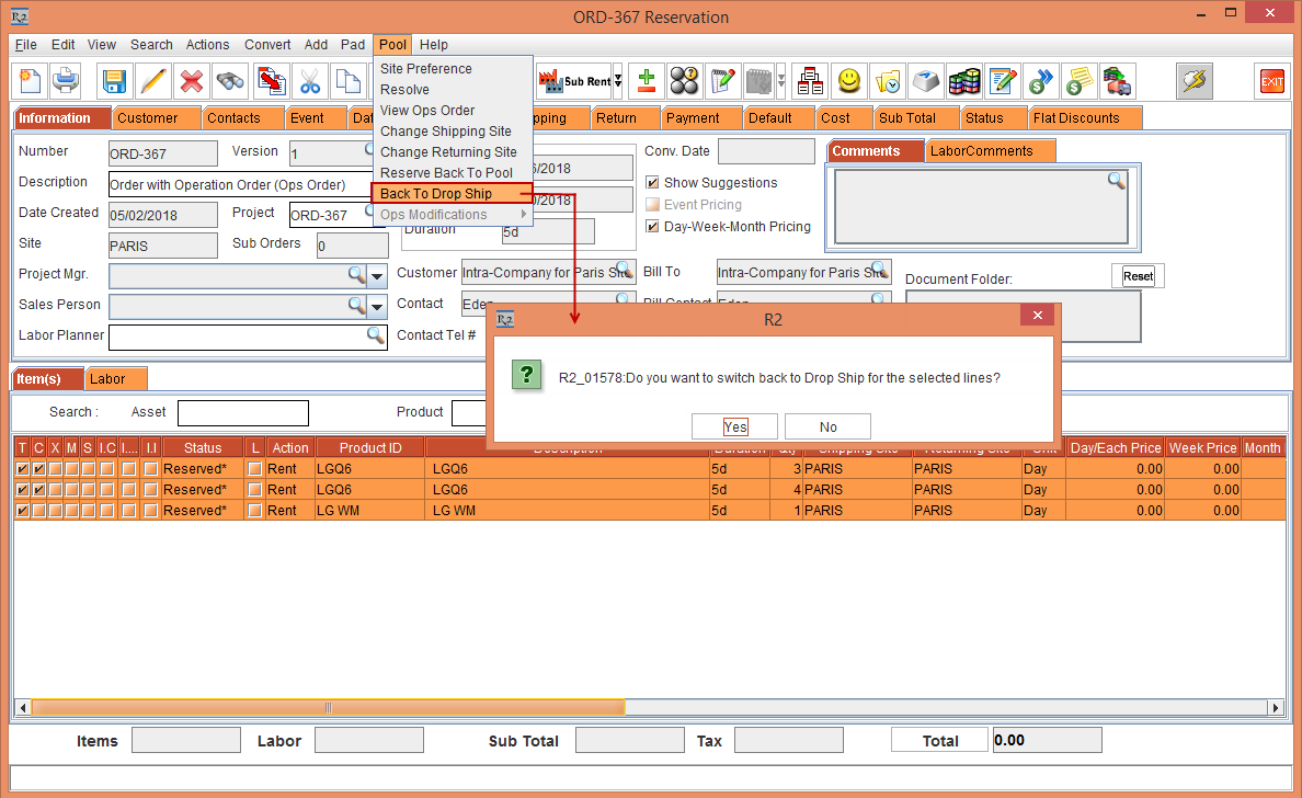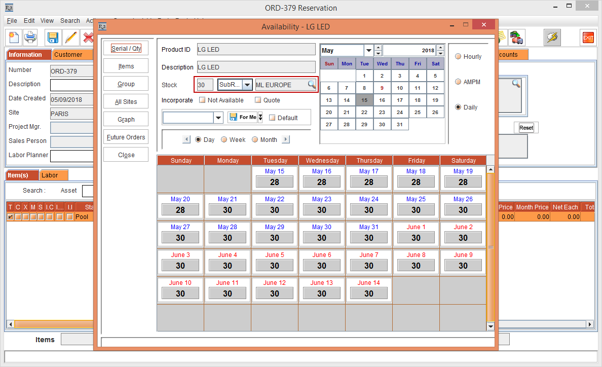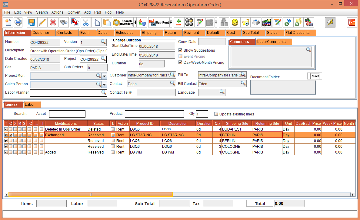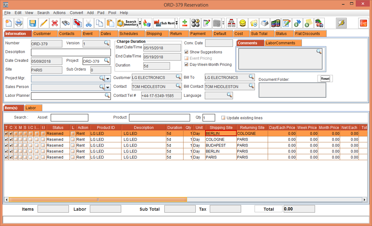 Whereas, the Status of the Item [LG WM-NS] is displayed as Reserved due to the Start Date [01-May-2018] and End Date [10-May-2018] which is within the Cutoff time in days [3]. The Shipping Site and the Returning Site is displayed as the Order Site [PARIS].