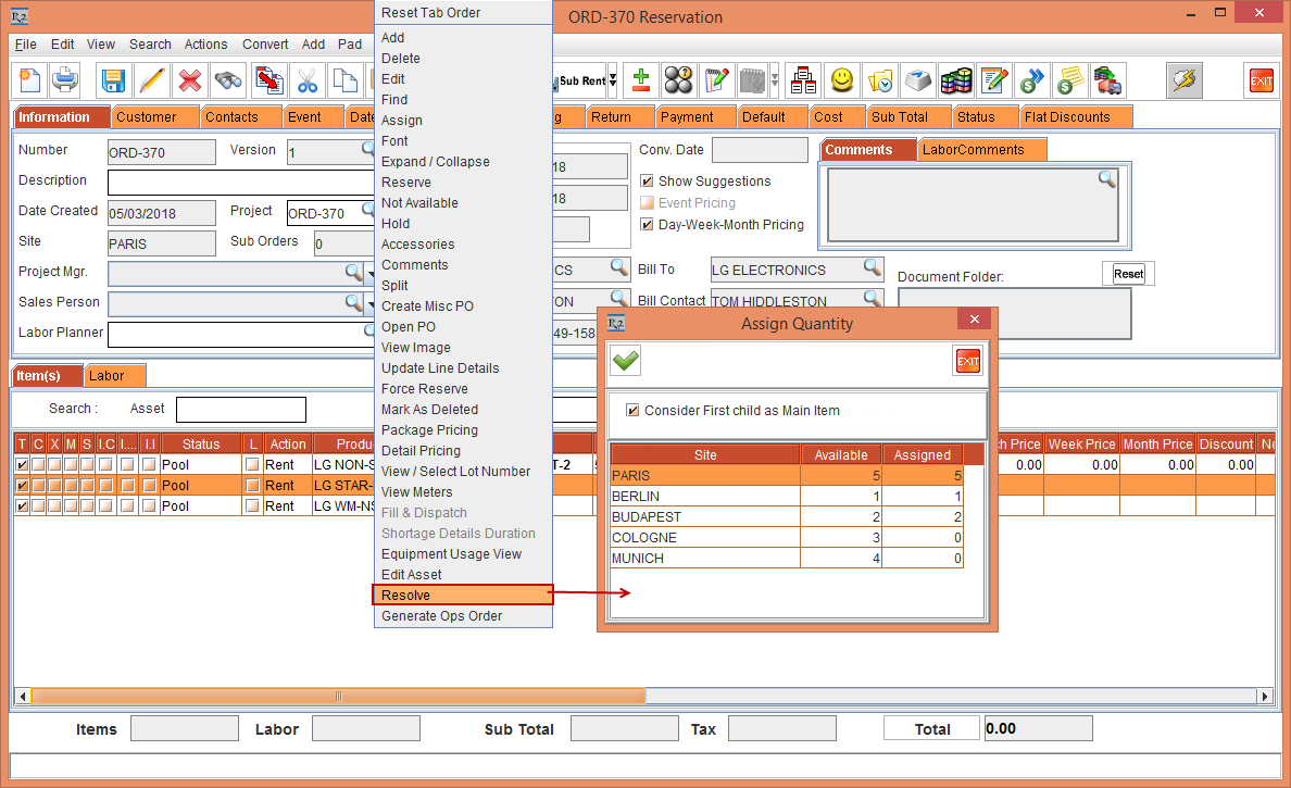 Select the Item line [LG LED] > right-click the > Resolve option. The Assign Quantity window is displayed with the stock Available at the Sites [BERLIN], [BUDAPEST], and [PARIS].