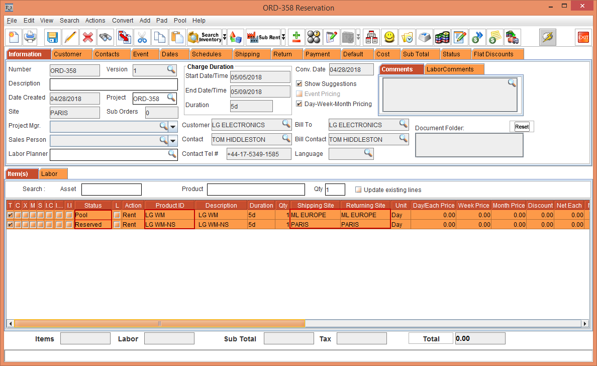 It is observed that the Rental Reservation Order [ORD-358] displays the Status of the Item [LG WM] as Pool due to the Start Date [05-May-2018] and End Date [10-May-2018] that is exceeding the Cutoff time in days [3]. The Shipping Site and the Returning Site is displayed as Sub-Region [ML EUROPE].