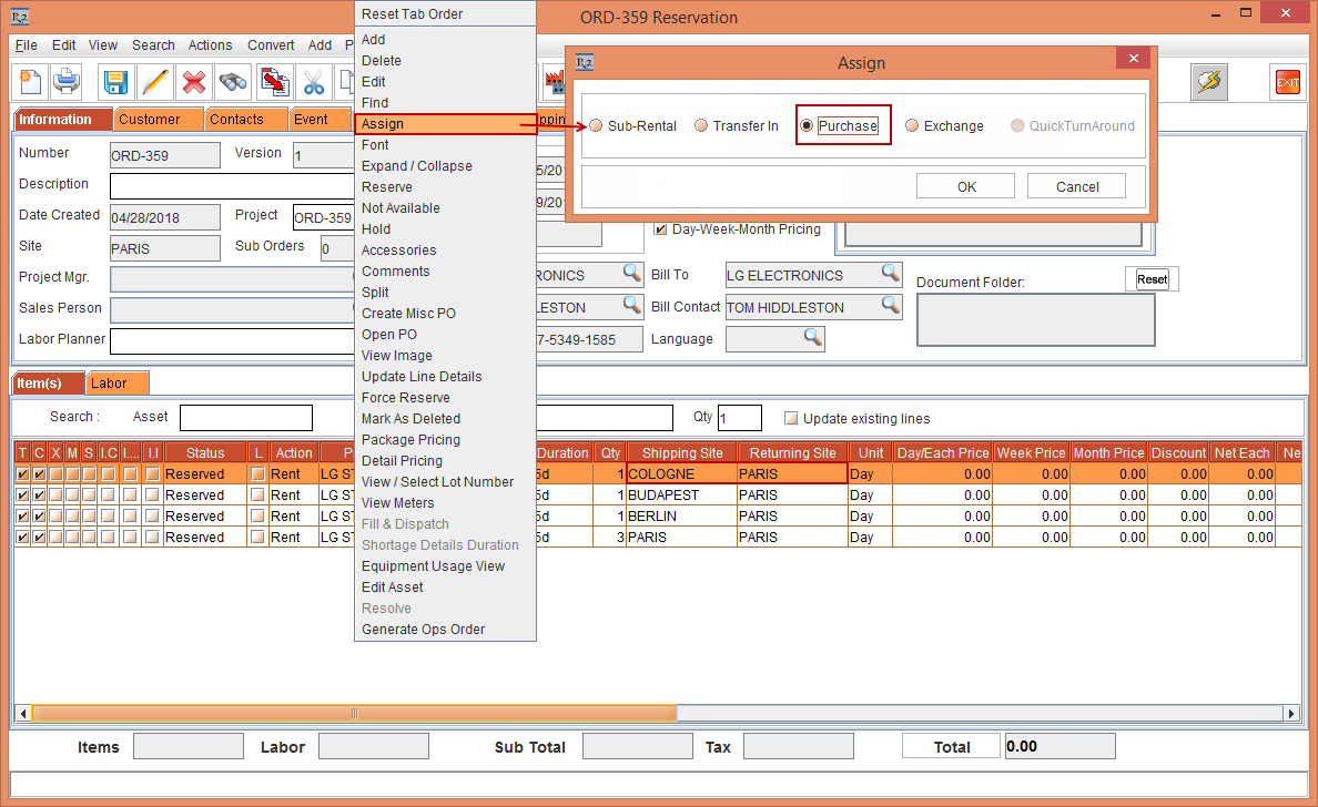 Select the Item line [LG STAR] with Item Qty 1 displaying the Shipping Site [COLOGNE] and Returning Site [PARIS]. Right-click > Assign > the Assign window is displayed. Select the Purchase radio button and click OK, as shown in Figure 4.5.