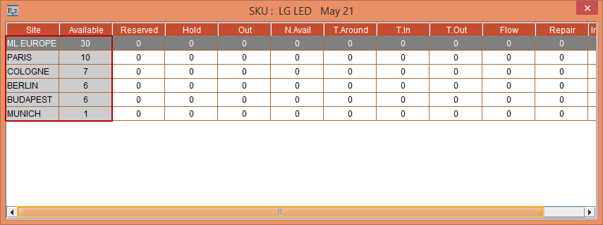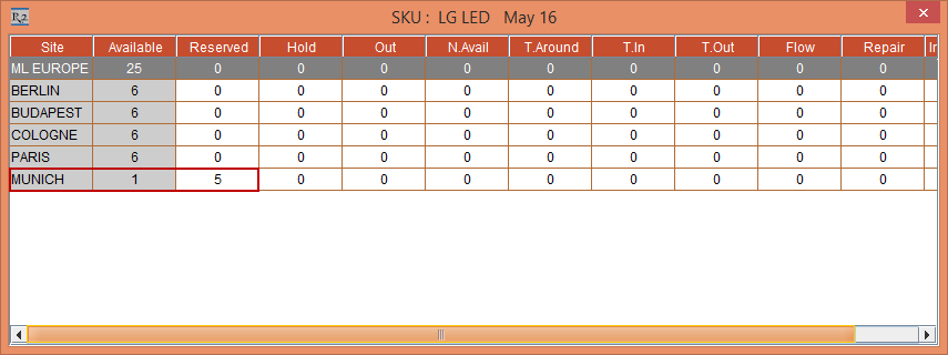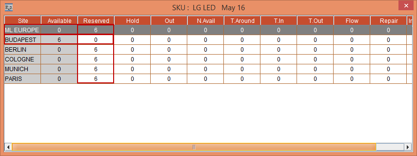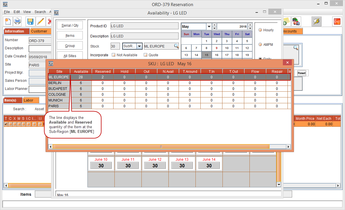The availability of the Item [LG LED] in the Sub-Region [ML EUROPE] is displayed as 19, whereas the Item at the Sub-Region [ML EUROPE] level is Reserved to 5 and is Reserved to 2 each at the Sites [BERLIN], [BUDAPEST], and [PARIS], as shown in Figure 4.11.