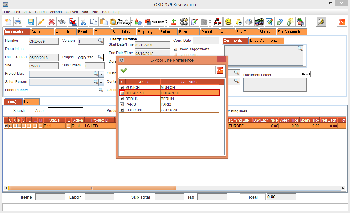 In the Rental Reservation Order [ORD-379], select the Pool menu > Site Preference option. The E-Pool Site Preference window is displayed exhibiting the Order level Site Preference, as shown in Figure 2.4.