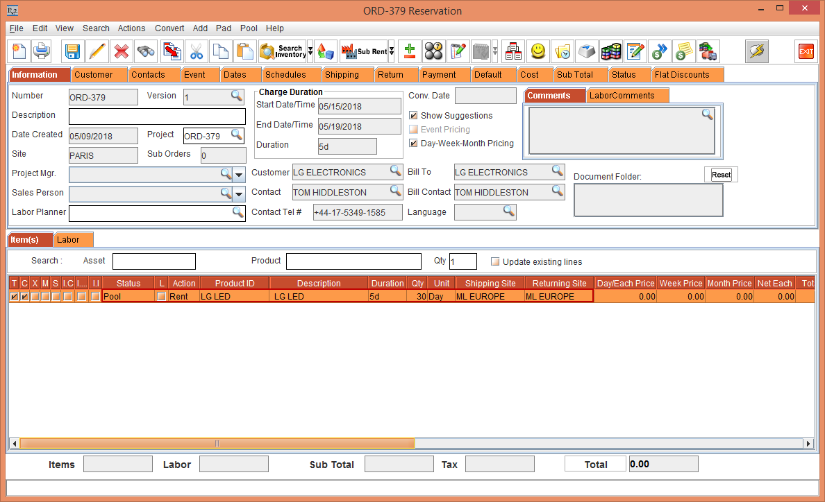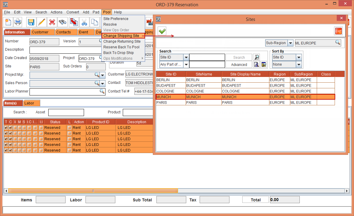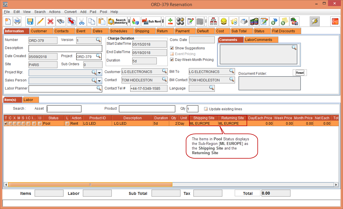 The Item line [LG LED] with 5 Qty is Pool reserved displaying the Status [Pool] with the Shipping Site and the Returning Site displayed as Sub-Region [ML EUROPE], as shown in Figure 4.8.