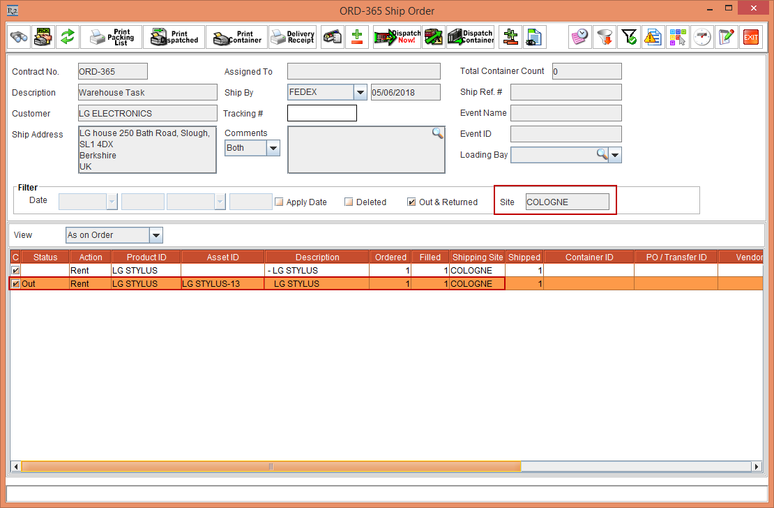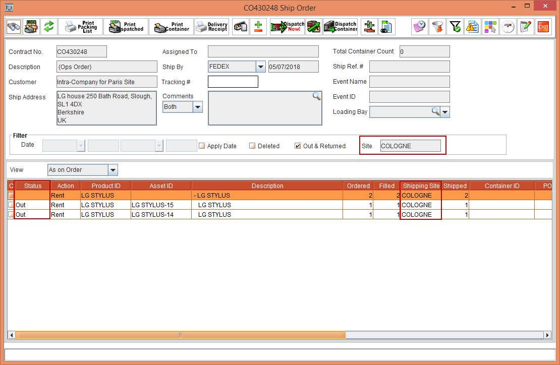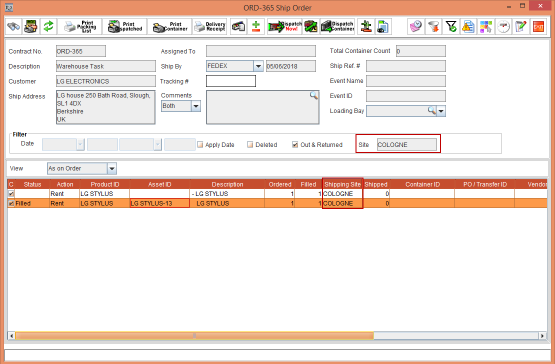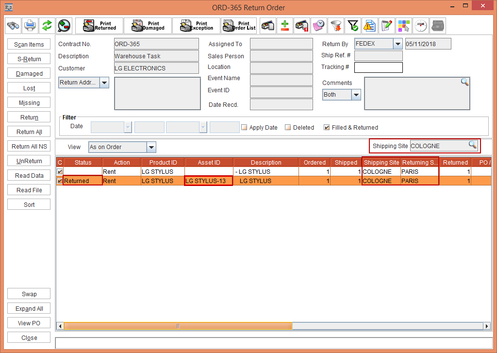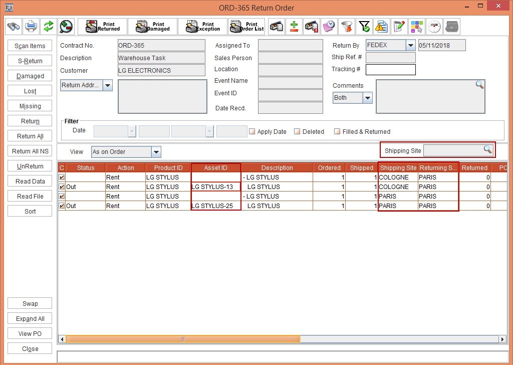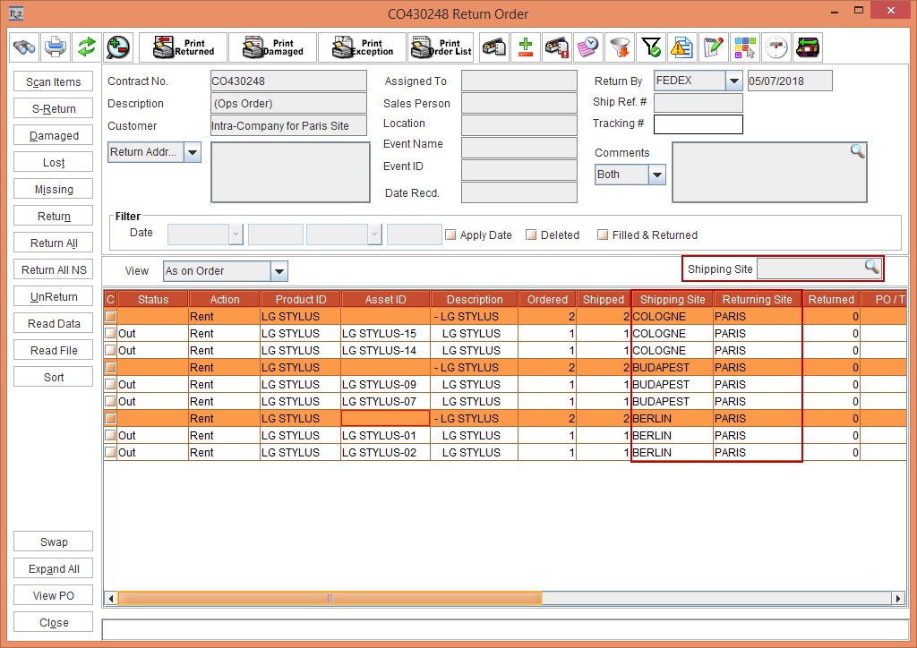 The EDR print will have details of the Shipping Site and Returning Site present in the Order.