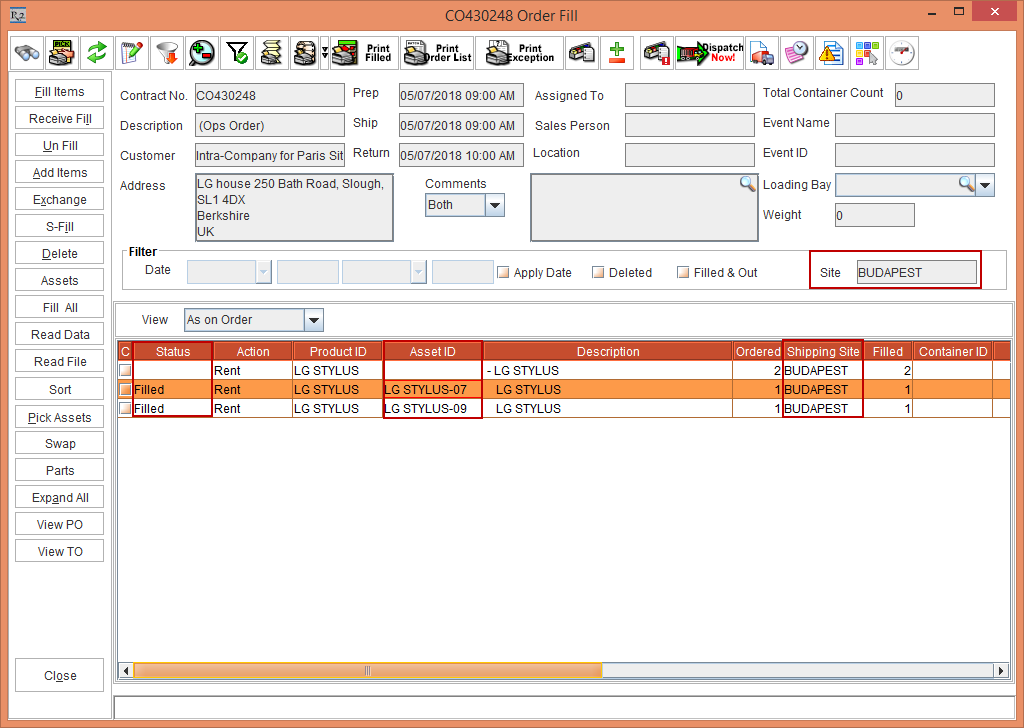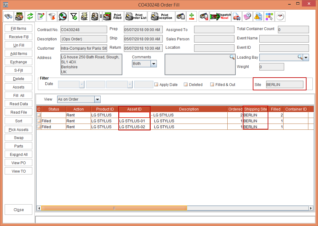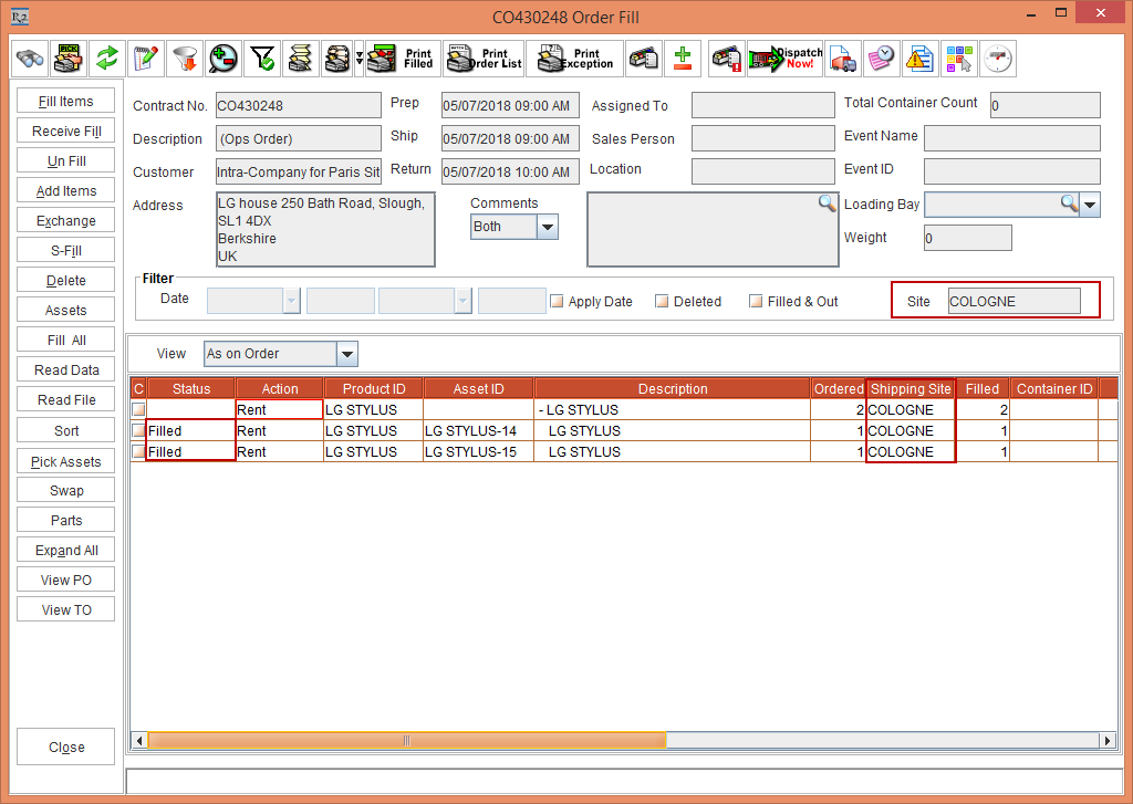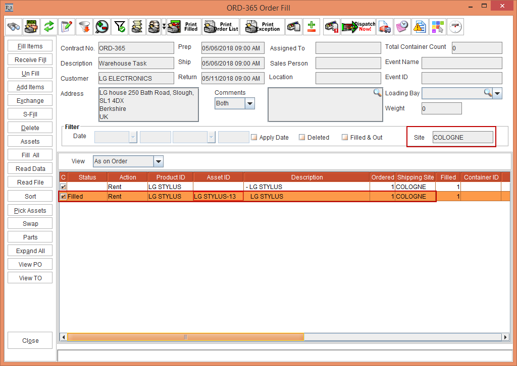 The Fill & Dispatch option in the Order > Item line > right-click is enabled only when the Shipping Site is the same as the Order Site.