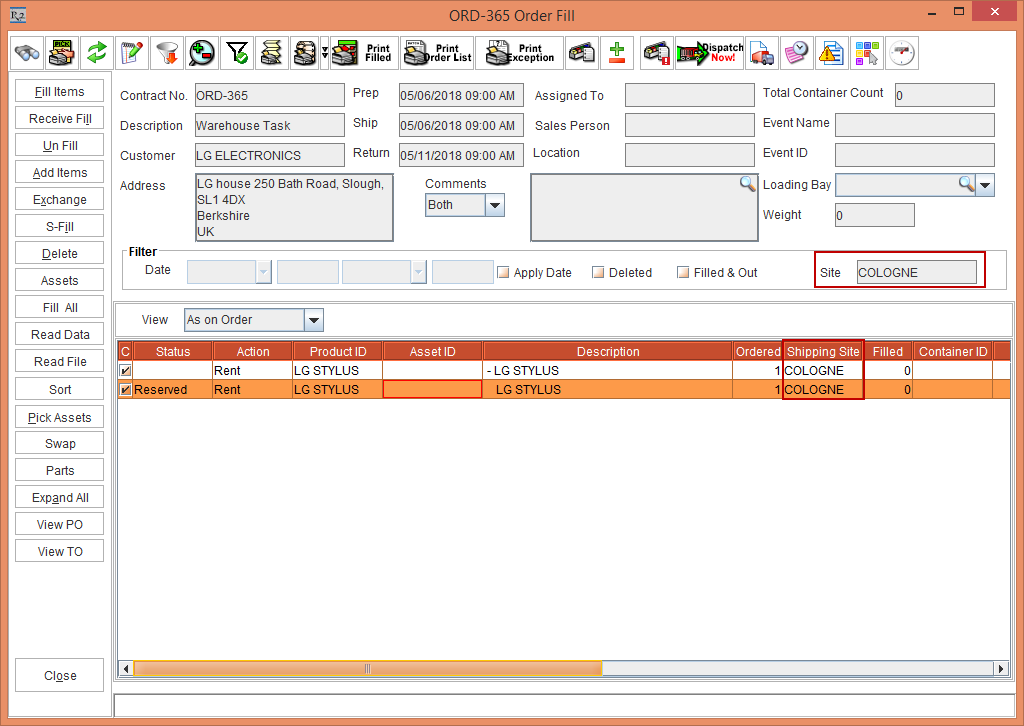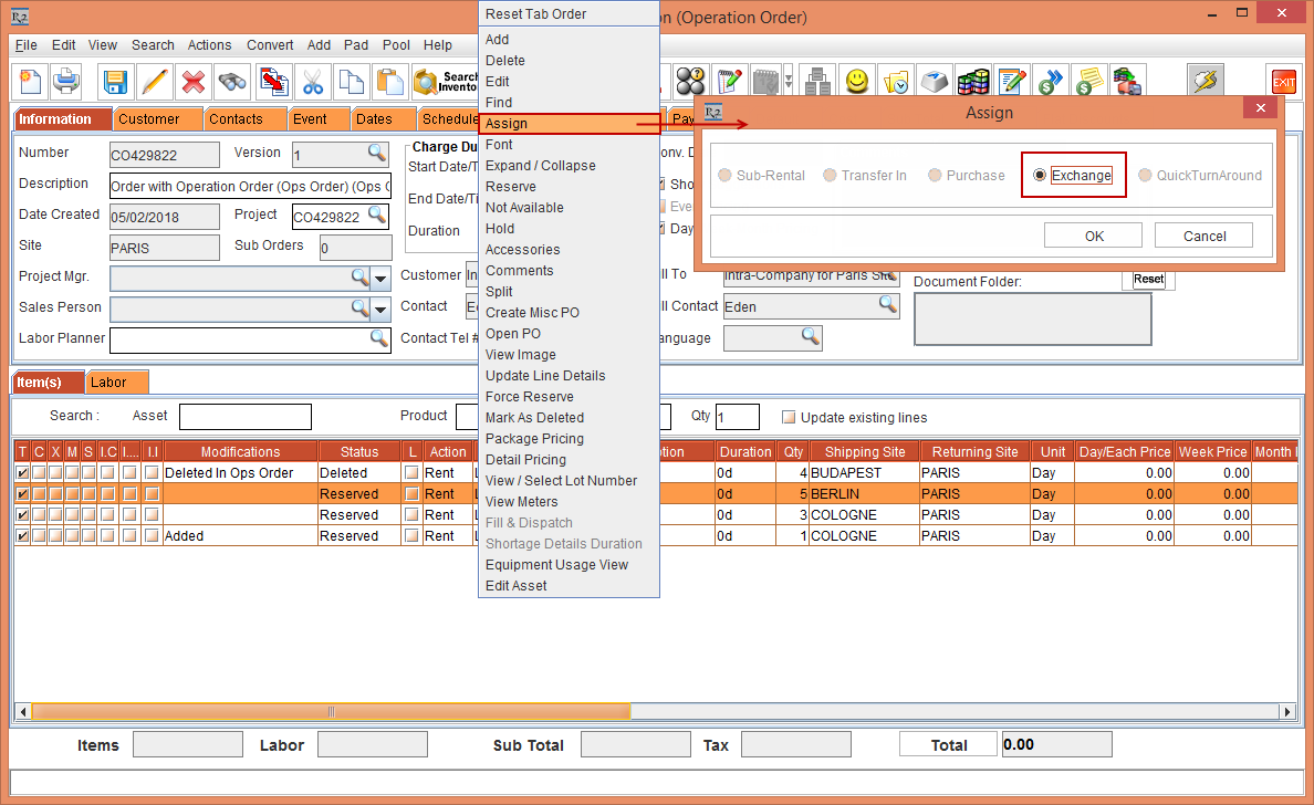 For the Item lines with Reserved Status, the Assign operations such as Sub-Rental, Transfer In, Purchase, and Exchange is created at the Shipping Site of the Item line.
