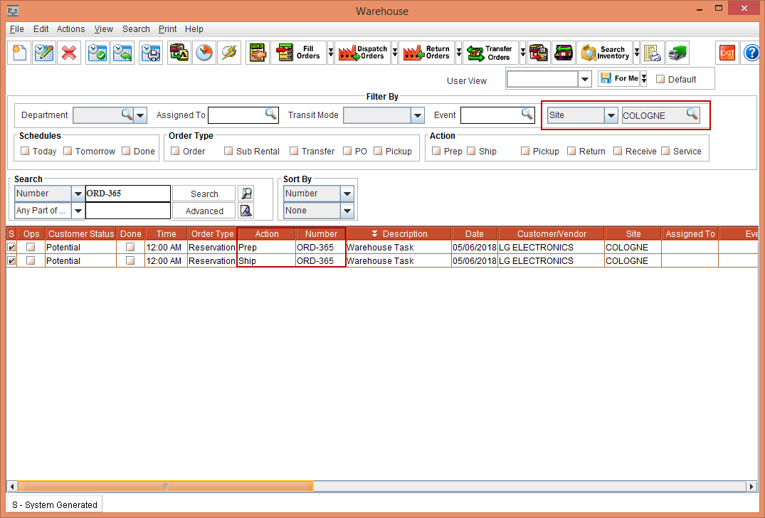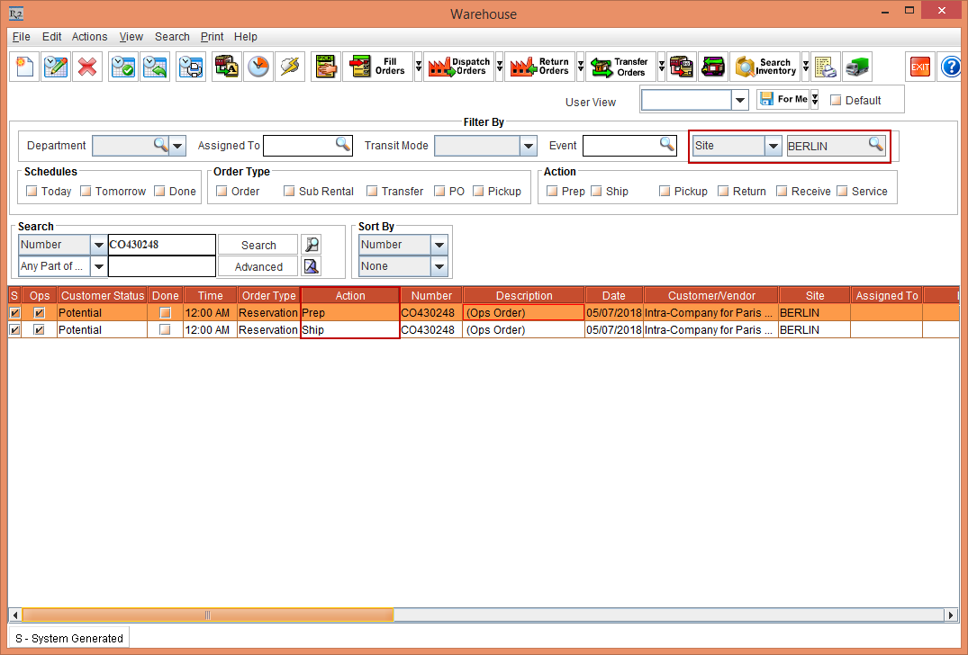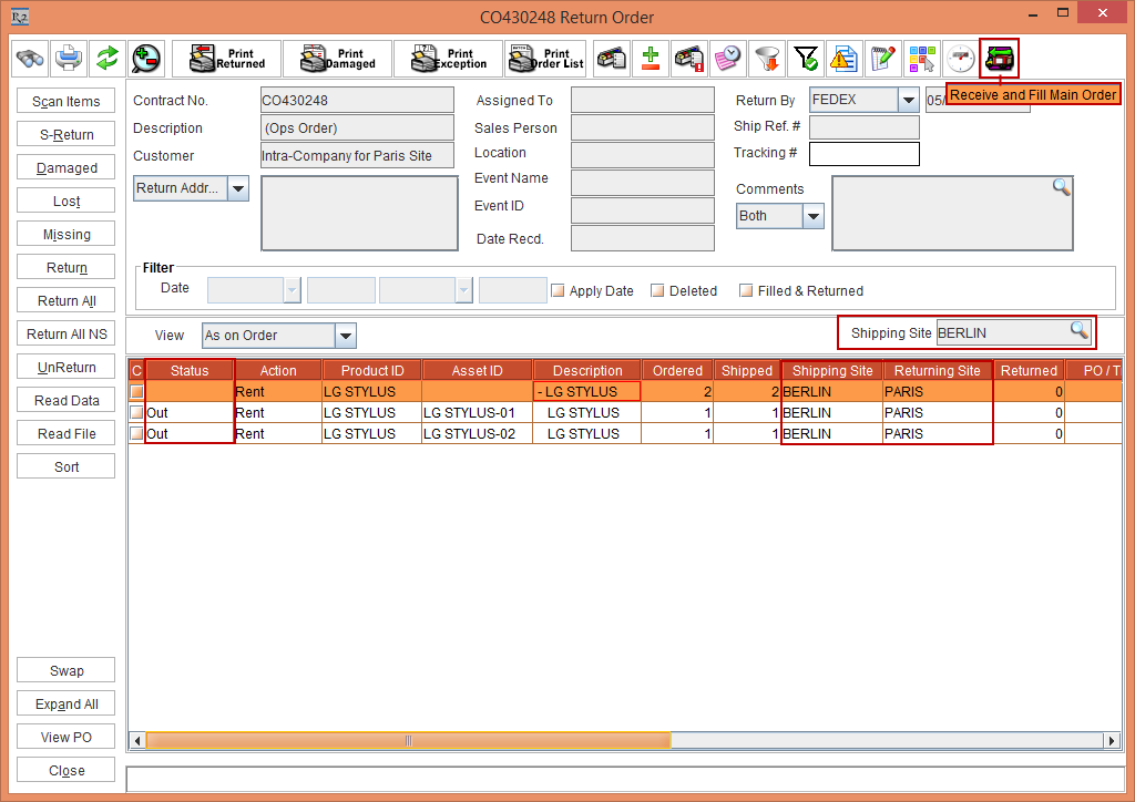 Similarly, when a Sub-Rent for the Item is preformed the Purchase Order for the Shipping Site [BUDAPEST] is created displaying the Site [BUDAPEST] and modifying the Item line Status in the Order [ORD-359] to S-Assign. Also, when a Transfer In for the Item is preformed the Transfer Order for the Shipping Site [BERLIN] is created displaying the Site [BERLIN] and modifying the Item line Status in the Order [ORD-359] to T-Reserved, as shown in Figure 4.7.