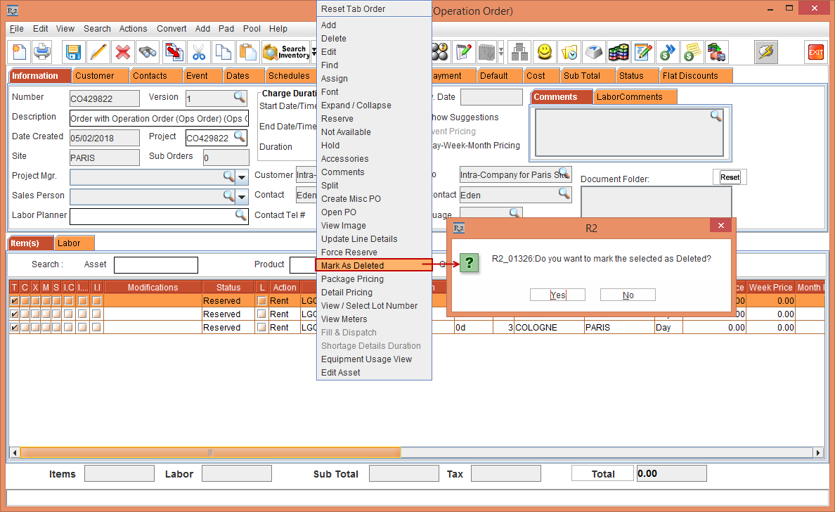 The Assign Asset option in the Order > Item line > right-click is disabled.