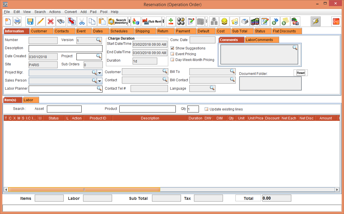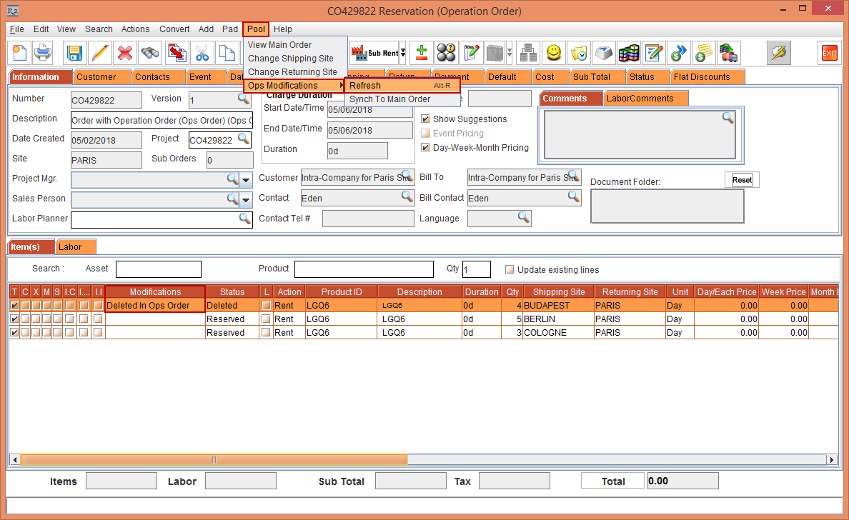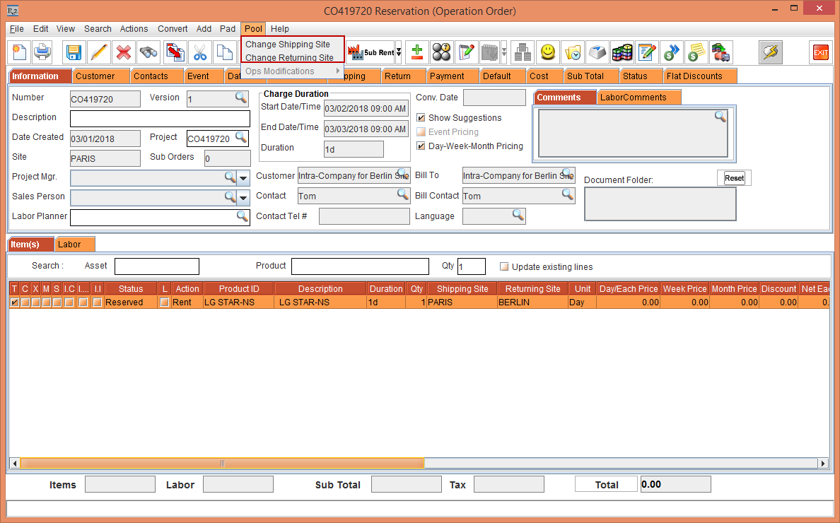E-Pool is not supported for a Quote Order. When a Quote Order is converted to a Rental Reservation Order, the Order Site is displayed both as Shipping Site and Returning Site within the respective columns based on the Cutoff time in days in the Sub-Region window.