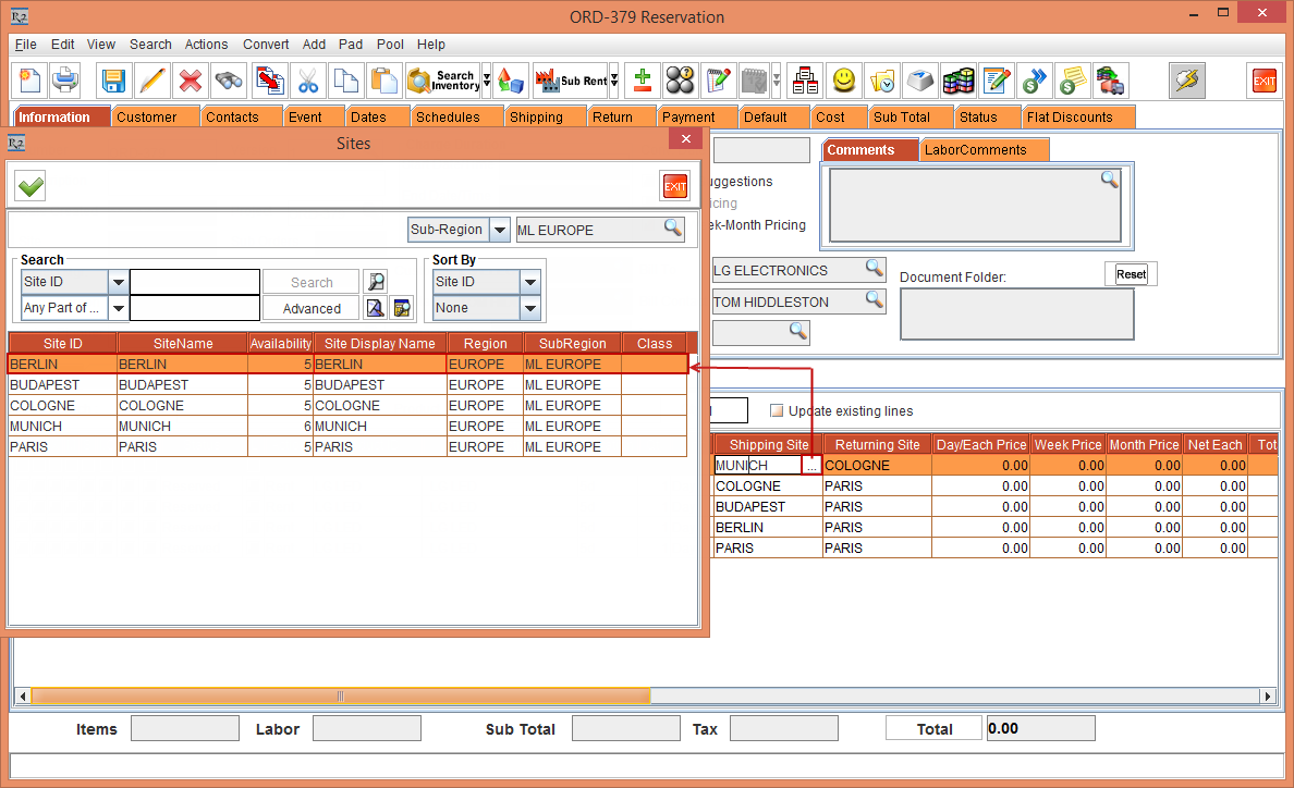 with the Shipping Site [ML EUROPE] and Returning Site [ML EUROPE], as shown in Figure 2.0.