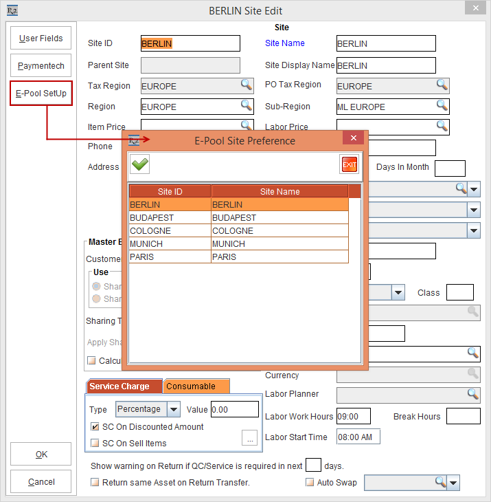 If you try to edit the Site Level Site Preference from the Site [BERLIN], and if you click the E-Pool SetUp button, the E-Pool Site Preference window displays the Site [BERLIN] first followed by Order of Site Preference as chosen in the Sub-Region level within the Group List window.