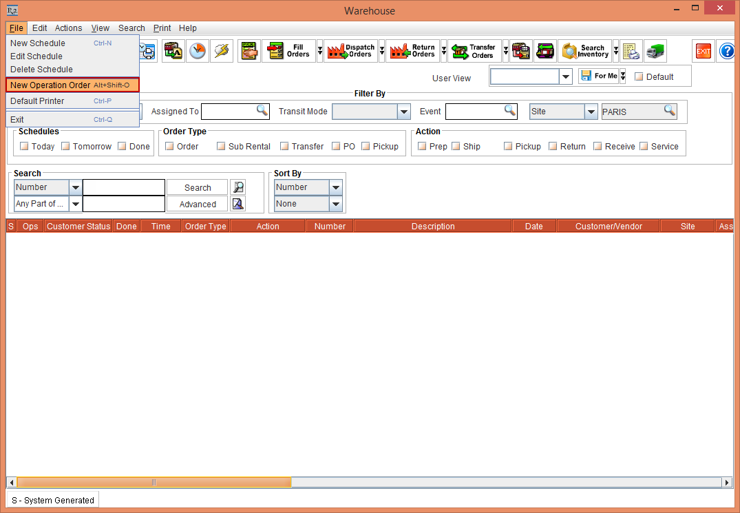 The Search Orders window and the Warehouse window displays the Ops column. The Ops check box is selected for the Operation Orders.