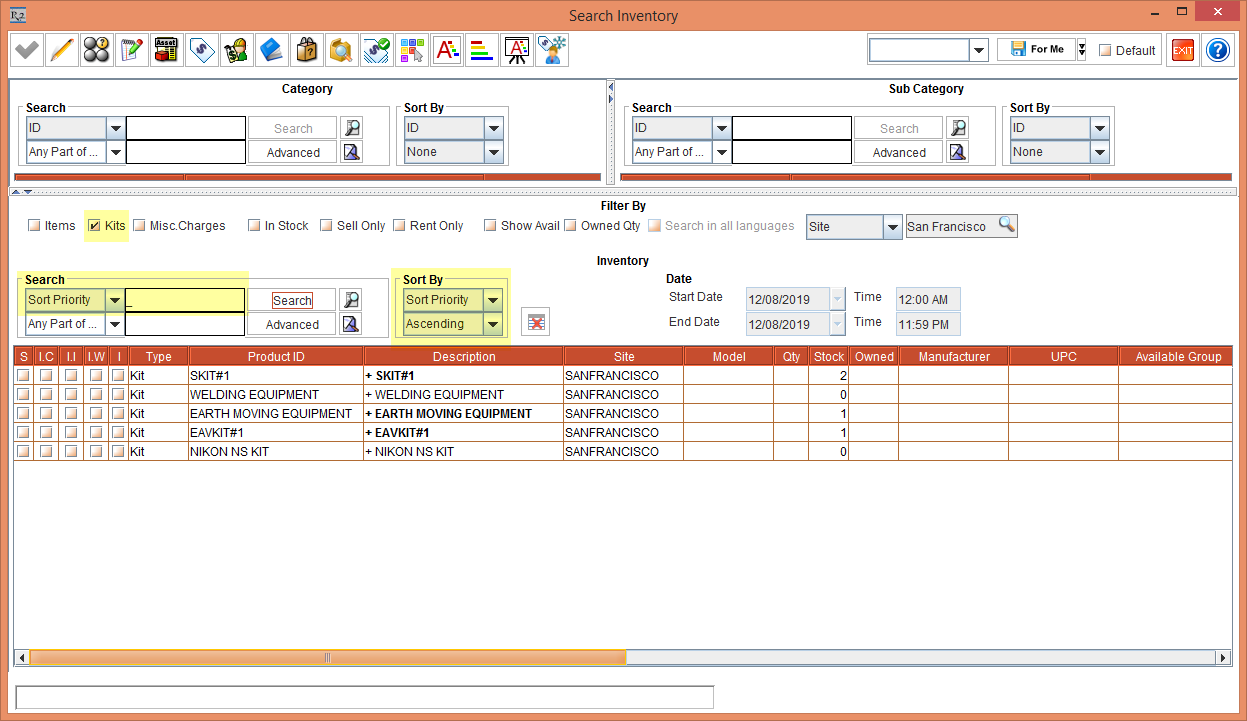 The Kits in the Search Inventory window is displayed sorted based on the Sort Priority, as shown in Figure 3.3. |