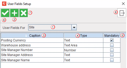 1. User Fields for: Select the entity from the dropdown. By Default, 'Site' entity is displayed and the grid presents the existing user fields defined for the Site entity.
