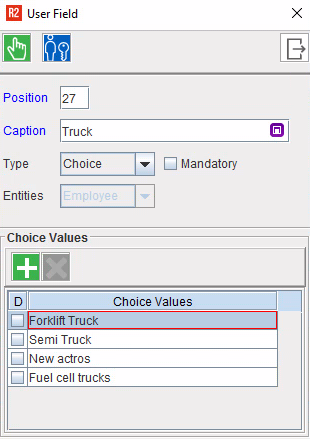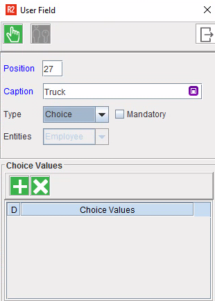 Select the value type for the defined field name. Possible options are Text, Number, date, boolean, Choice, R2entity, and Text area.