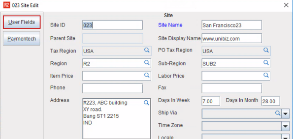 Example: If you create a UDF named 'Time-Zone' for the 'Site' entity. Then the 'Time-Zone' field displays in the 'Site edit' window. Also, the system allows you to perform search on 'Sites' based on the 'Time-Zone' UDF value.