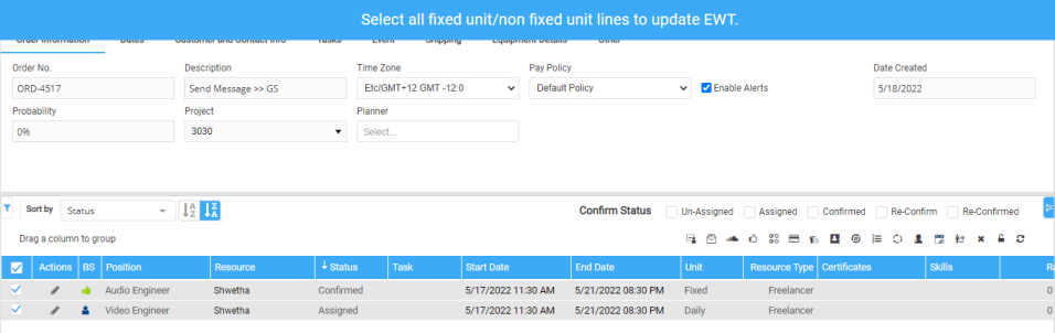 Every booking line has different properties like Resource type (picks resource type based on the resource), Unit, Pay policy etc., which defines Unit to be picked on the EWT. In such cases, system restricts updating EWTs as shown below.