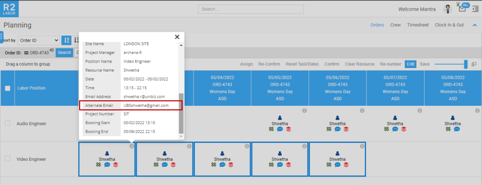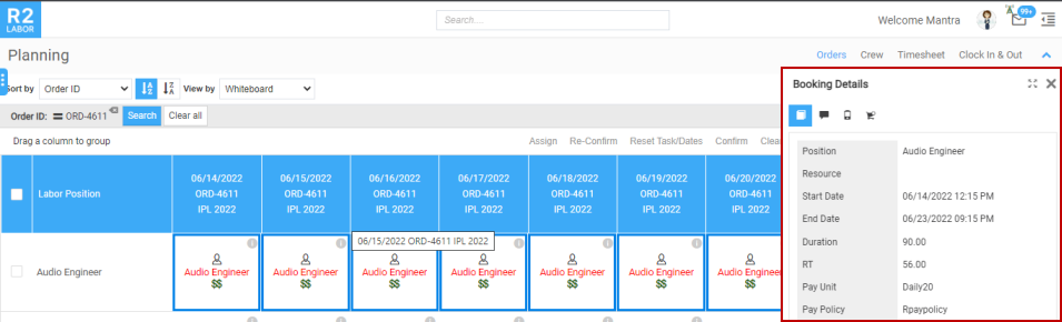 Booking Dates: Displays the Labor position required on the order on the respective dates