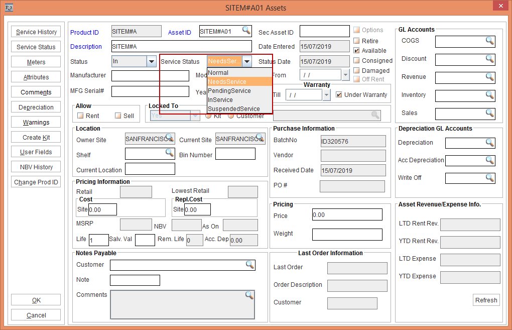 Edit the Asset [SITEM#A01] and modify the Service Status drop-down to NeedsService, as shown in Figure 1.0.